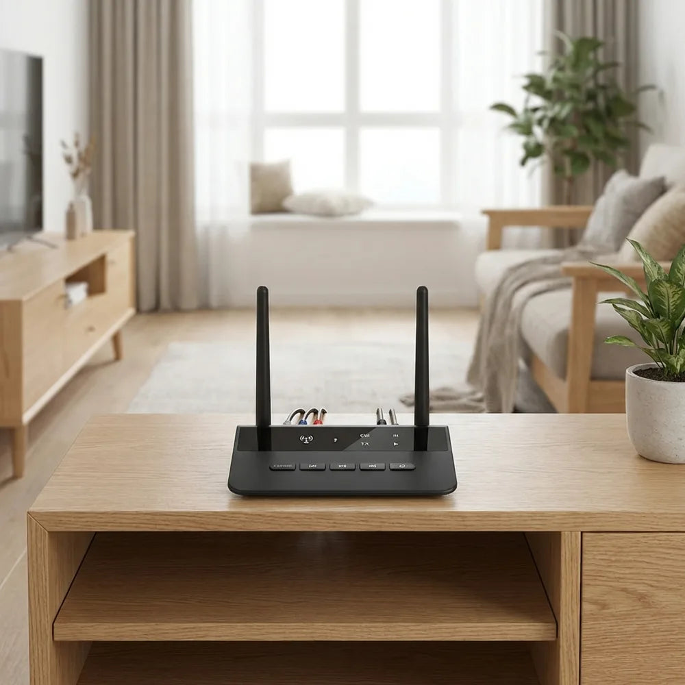 Bluetooth ljudadapter som fungerar som både sändare (TX) och mottagare (RX) för utrustning med 3,5 mm AUX eller RCA. I TX-läge skickas ljud från exempelvis TV eller dator till Bluetooth-hörlurar eller högtalare. I RX-läge tas ljud emot från mobil eller dator och spelas upp via stereo, förstärkare eller aktiva högtalare. Stöd för aptX HD ger bättre ljudkvalitet än standardkodekar när kompatibla enheter används. Dubbla externa antenner och Bluetooth 5.4 ger stabil anslutning och upp till 15 m räckvidd.