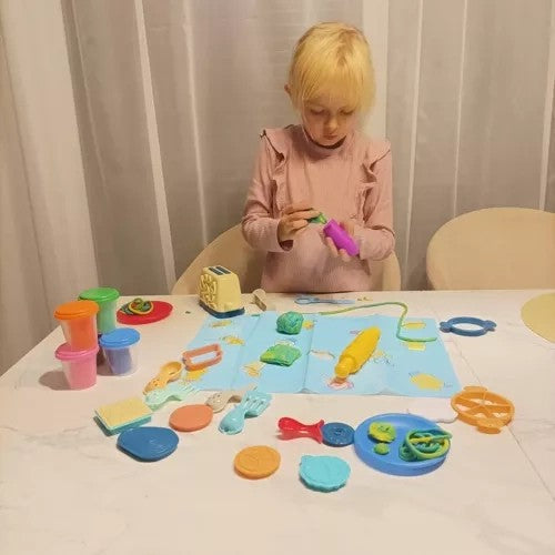 Leklera-set med brödrost och tillbehör som gör det enkelt att forma, pressa och skapa egna lerfigurer. Mini-brödrosten används som ett lekverktyg för att ge leran form, medan tallrikar, säkra bestick och en mönstrad kavel hjälper till att bygga upp fler detaljer. Fem lermassor ingår så att barn kan blanda nyanser och variera sina skapelser. Passar för kreativ lek inomhus och ger träning av finmotorik genom knådning, rullning och formning. Rekommenderas från 3 år på grund av små delar.