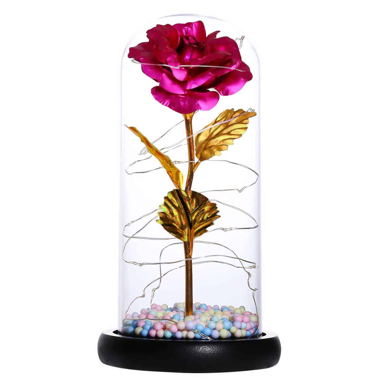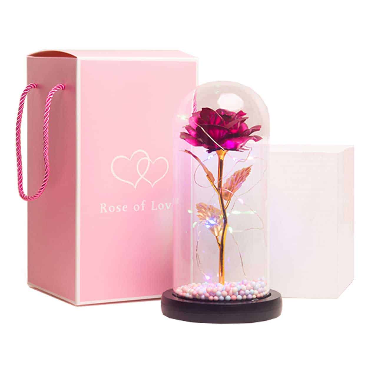 Evighetsros / glaskupa / LED-lampor – dekorativ present – 24k guldpläterad ros