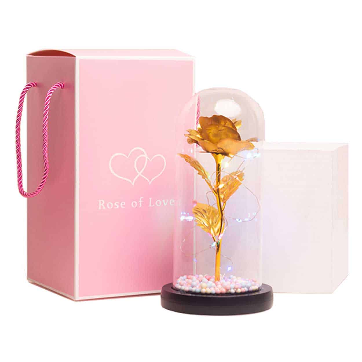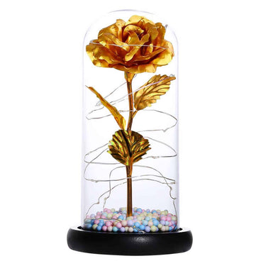 Evighetsros / guldpläterad ros – present i glaskupa – LED-ljus, 2x AAA