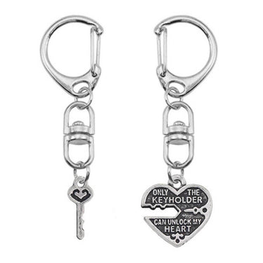 Tvådelad nyckelring för par som delas mellan två personer. Delarna bildar ett matchande motiv och har graverad text med budskapet Only the key holder can unlock my heart. Formatet är kompakt och passar på nyckelknippa, väska eller som liten accessoar i vardagen. Metallkonstruktionen ger bra slitstyrka vid daglig användning och gör att nyckelringen håller formen över tid. En enkel detalj som gör det lätt att bära med sig en gemensam symbol.