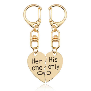 Tvådelad nyckelring för par som delas mellan två personer. Delarna har matchande text med citatet Her One och His Only, vilket gör det enkelt att bära en gemensam symbol i vardagen. Nyckelringen passar på nyckelknippa eller som liten accessoar på väska och fungerar även som en enkel gåva. Formatet är kompakt och lätt att ta med, samtidigt som de två delarna hör ihop när de sätts bredvid varandra.