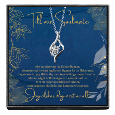 Soulmate-halsband med kubisk zirkonia som ger ett klart sken och en tidlös look. Smycket är tillverkat i rostfritt stål som är tåligt och skonsamt mot huden, vilket gör det lämpligt för regelbunden användning. Kedjan har justerbar längd för en bekväm passform. Halsbandet levereras tillsammans med ett kort med ett kärleksfullt budskap, vilket gör det enkelt att ge bort som present vid födelsedag, årsdag eller när du vill visa uppskattning.
