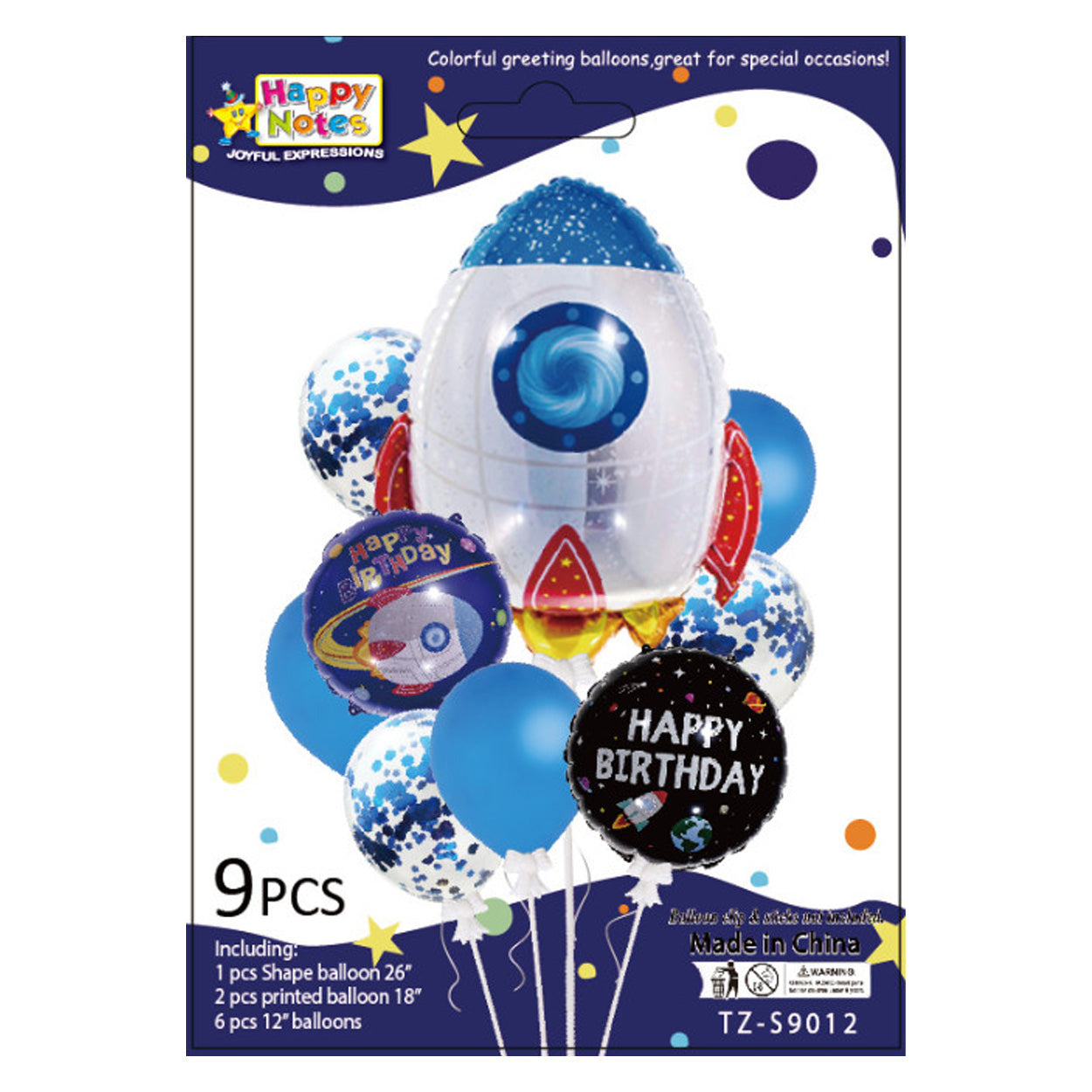 Rymd ballongkit för födelsedag och barnkalas med rakettema. Kitet innehåller en stor raketformad ballong, två runda ballonger med tryck samt både vanliga och konfettifyllda ballonger. Ballongerna fungerar som dekoration på vägg, vid entré eller som del av en ballongbukett och kan även användas som lekfull detalj på kalasbordet. Ballongband ingår för enklare upphängning och knytning. Totalt ingår 9 ballonger i setet.