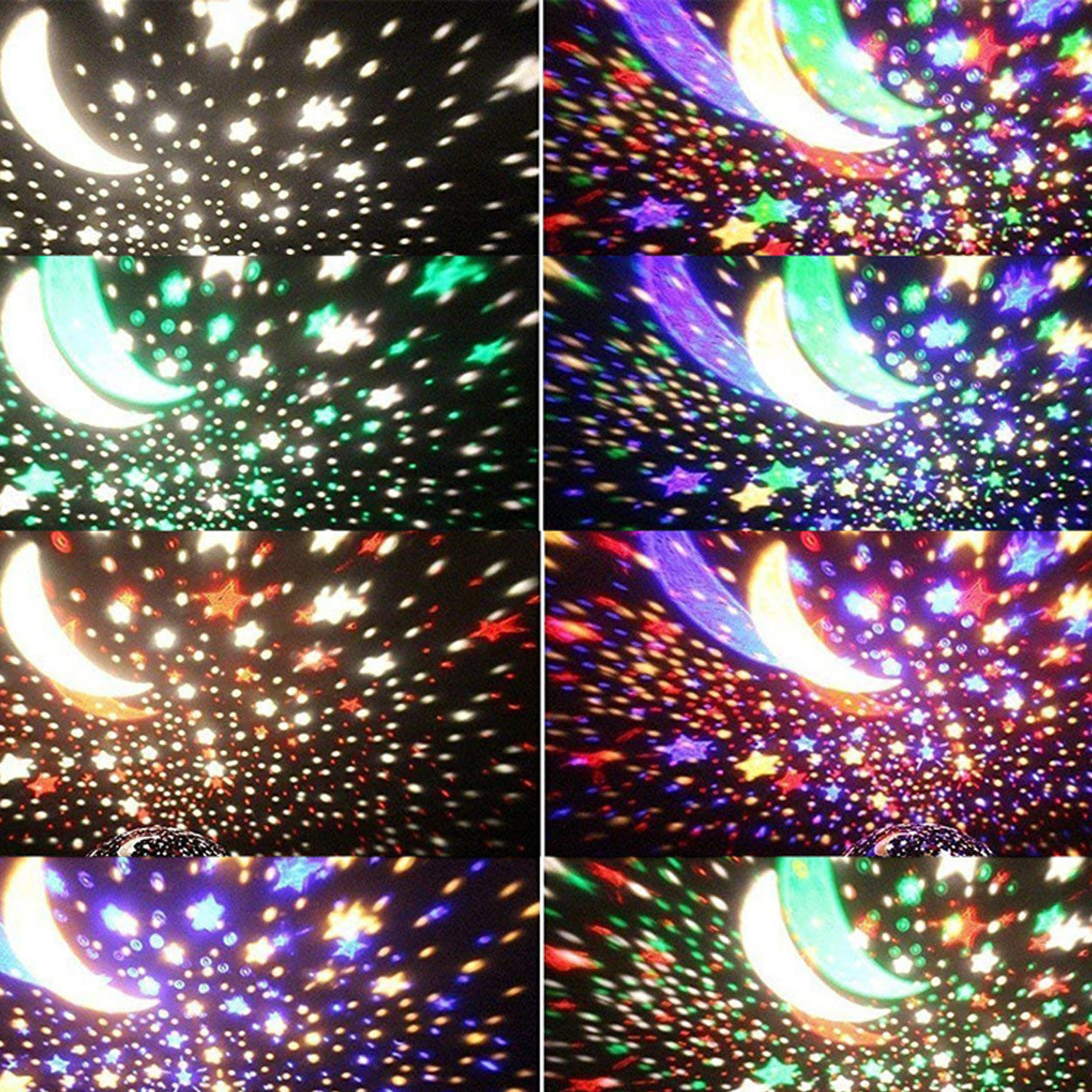 Stjärnprojektor nattlampa som projicerar ett stjärnklart mönster på väggar och tak. Ljuset fungerar som ett mjukt nattljus i barnrum och kan även användas som dekorationsbelysning vid sagostund eller vila. Lampan har flera ljuslägen med både vitt ljus och färgskiftande projektion som växlas med knapptryck. Strömförsörjning kan ske via USB-kabel eller med 4 x AAA-batterier, vilket gör den enkel att placera även utan vägguttag. USB-kabel ingår.