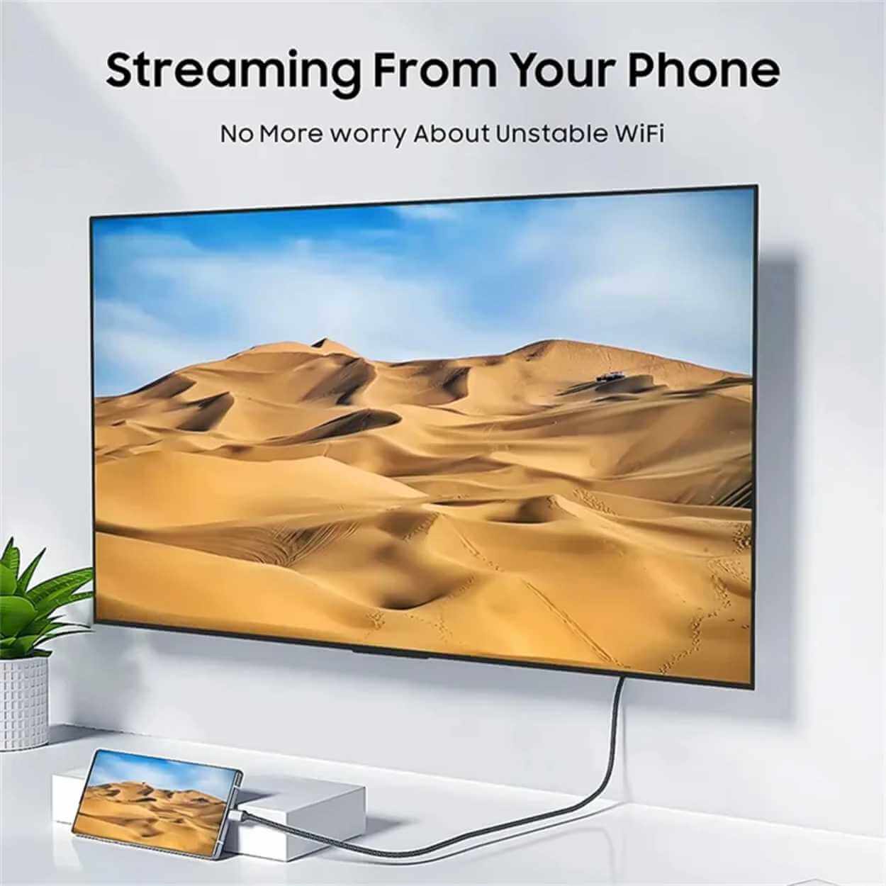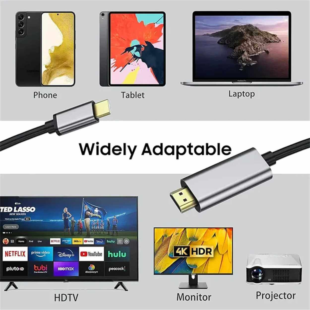 USB-C till HDMI-kabel för att ansluta en USB-C-enhet till en HDMI-skärm eller TV. Stöd för 4K-upplösning upp till 60 Hz ger en skarp och följsam bild vid presentationer, film och arbete på större skärm. Kabeln har USB-C hane i ena änden och HDMI hane i den andra, vilket ger en enkel direktkoppling utan extra adaptrar. Med 2 meters längd blir det lättare att placera dator, surfplatta eller mobil där det passar, även när skärmen står en bit bort. Guldpläterade kontakter bidrar till stabil anslutning.