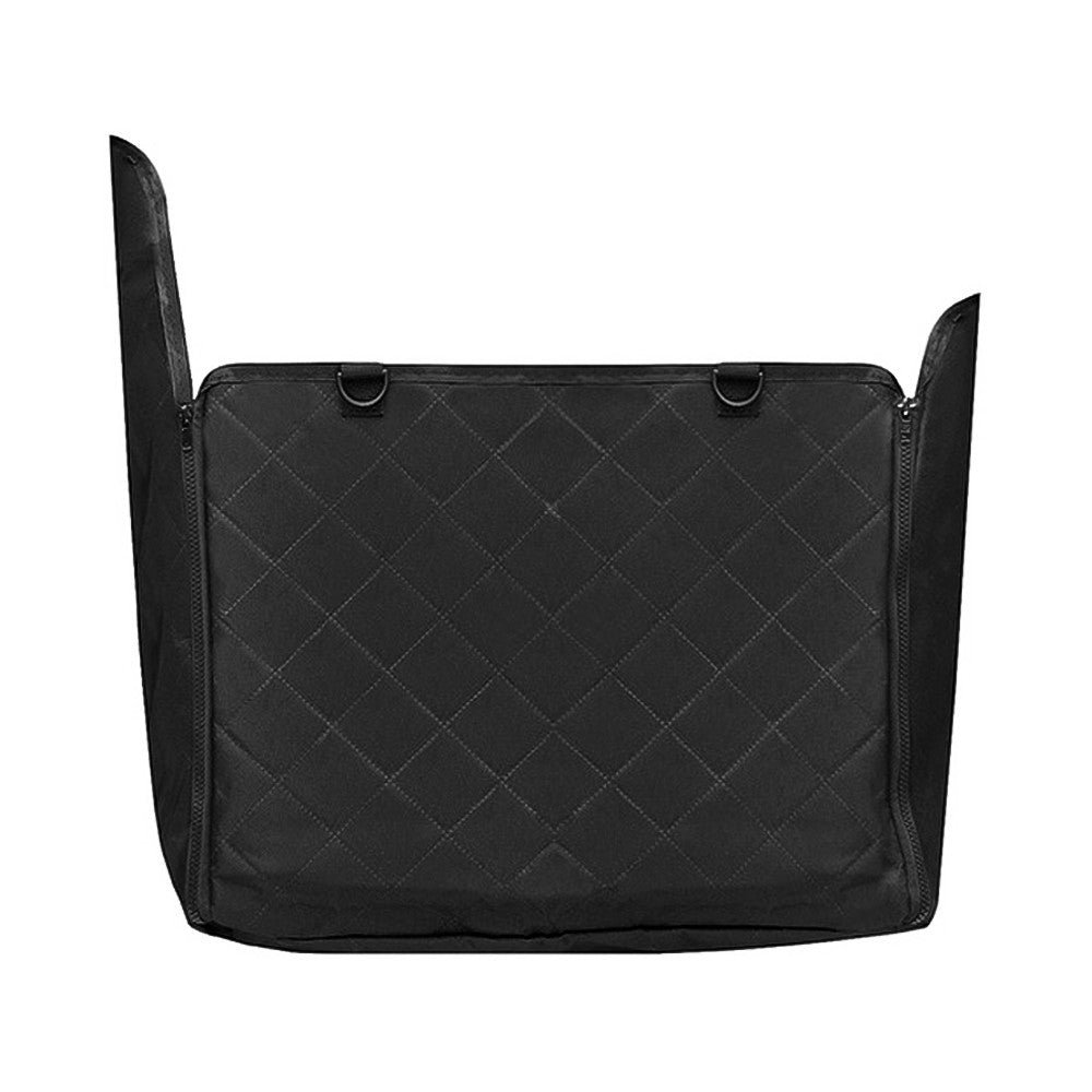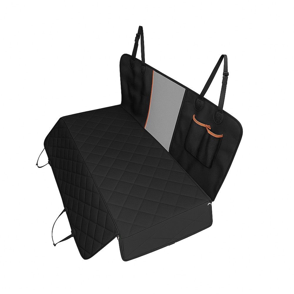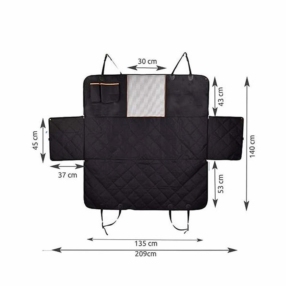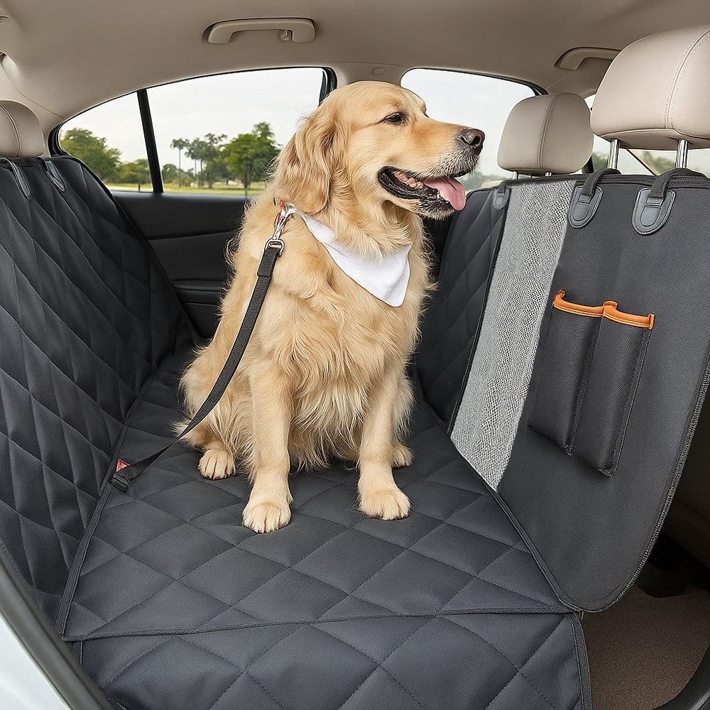 Baksätesskydd för hund som håller bilens klädsel ren från väta, smuts och hår. Den vattentäta ytan gör avtorkning enkel efter promenader och resor. Undersidan har ett halkskyddande gummilager som hjälper skyddet att ligga stabilt under färd. Överdraget fästs vid nackstöd och sidohandtag med krokar och har öppningar för säkerhetsbälte så att sele kan användas. Sidoflikar som stängs med dragkedja skyddar dörrsidor och underlättar i- och urstigning. Ett främre nät minskar risken att djuret tar sig till framsätet.