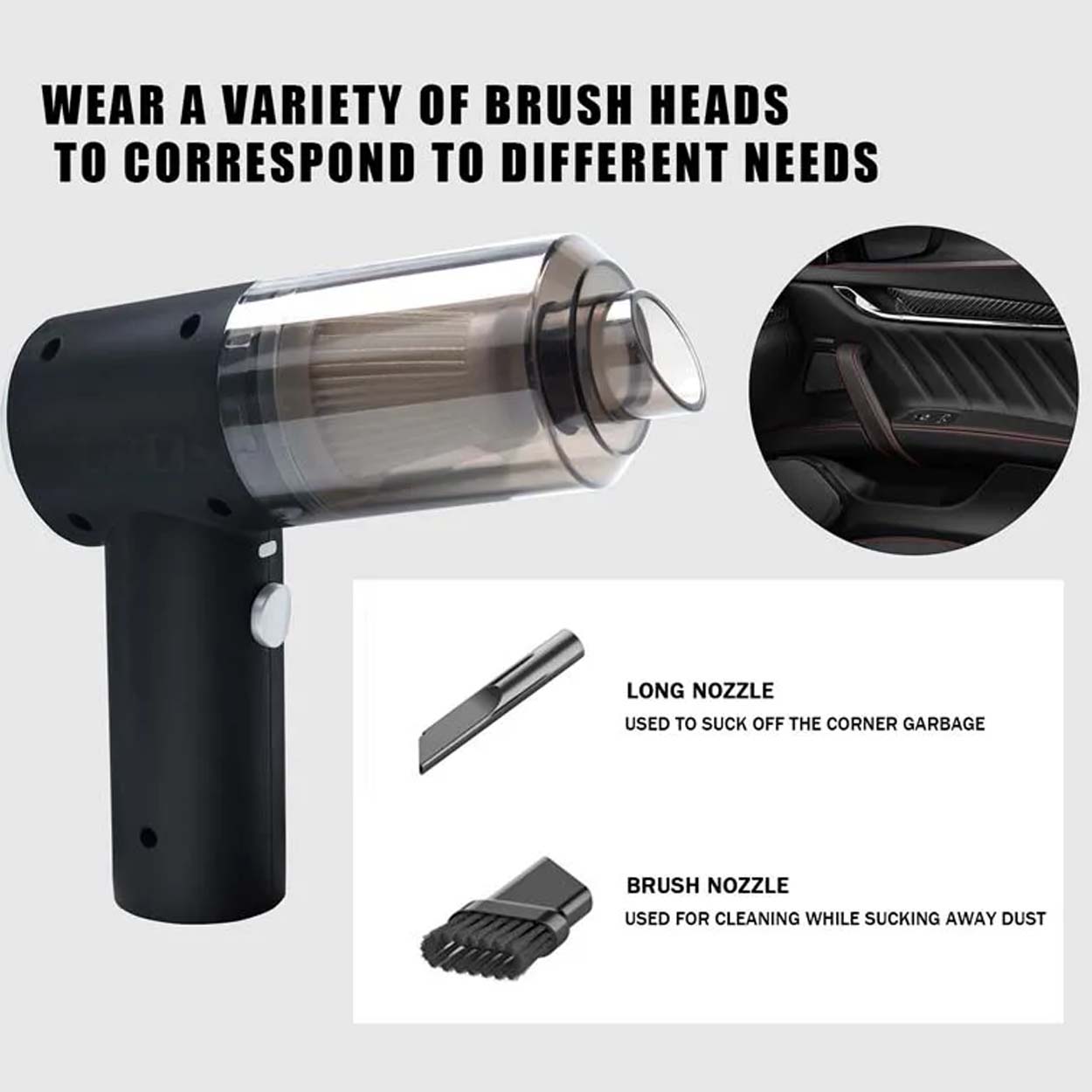 Sladdlös handdammsugare för snabb rengöring av bilens interiör. Motoreffekt på 120 W ger bra kraft för smulor, damm och grus i säten, mattor och trånga utrymmen. Laddning sker via USB, vilket gör det enkelt att ladda i bilen eller hemma. Inbyggd LED-lampa hjälper när du städar i mörka hörn och under säten. Påslös konstruktion med filter gör den enkel att tömma och hålla fräsch. Smalt munstycke och borste medföljer för mer precis rengöring.