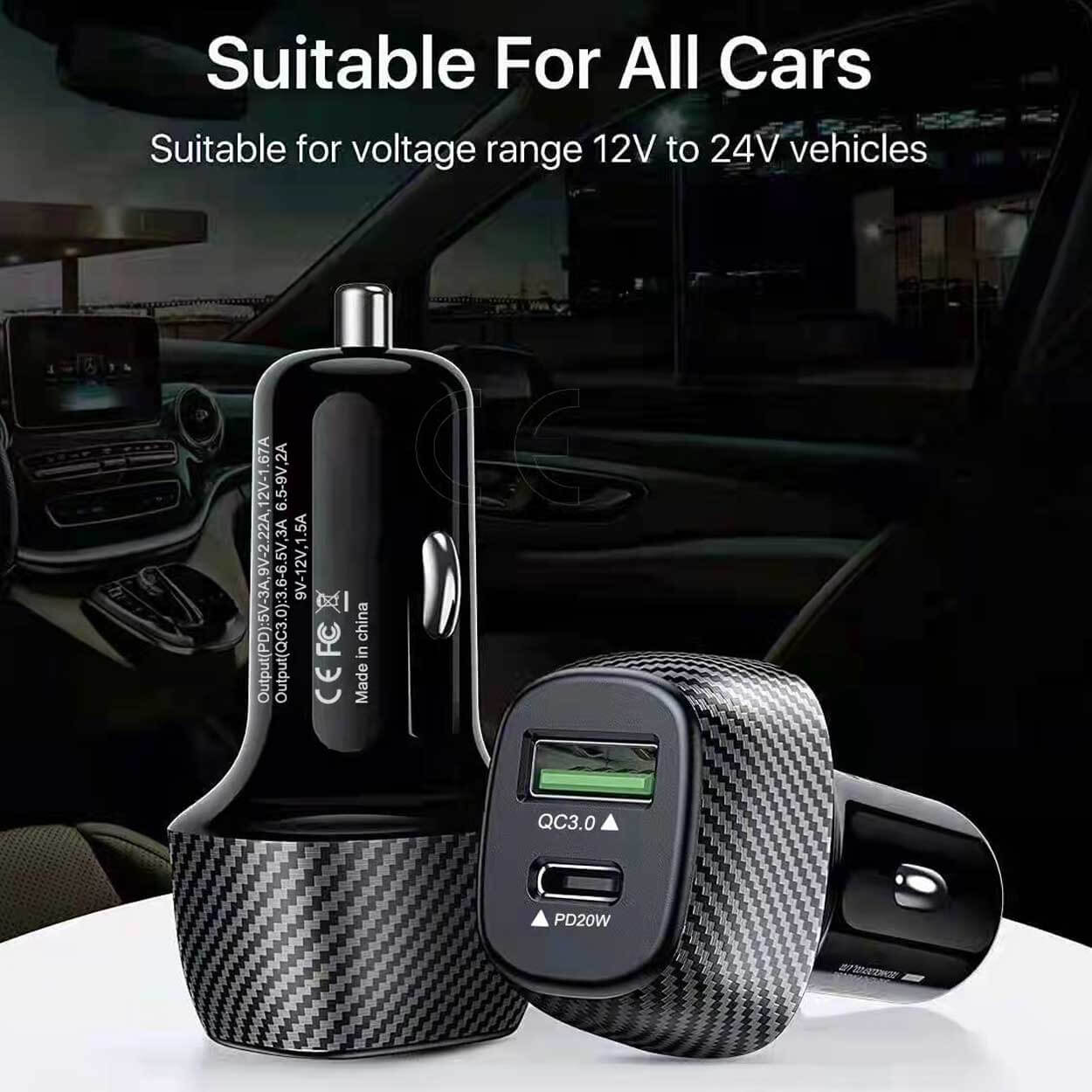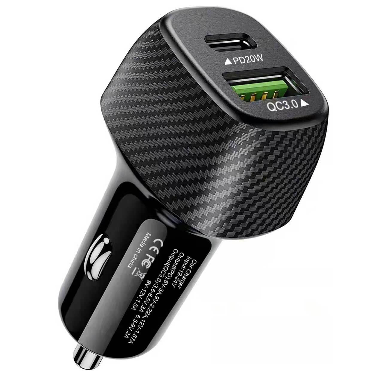 Billaddare med två snabbladdningsportar för samtidig laddning av två enheter i bilen. USB‑C-porten ger upp till 20 W via Power Delivery och USB‑A-porten ger upp till 18 W med Quick Charge 3.0. Laddaren ansluts till 12–24 V cigarettändaruttag och fungerar i de flesta fordon. Inbyggt intelligent chipset och överströmsskydd hjälper till att skydda anslutna enheter mot överladdning. Kompatibel med vanliga laddkablar för Lightning, Micro‑USB och USB‑C och kan användas för exempelvis iPhone, Samsung och Xiaomi.