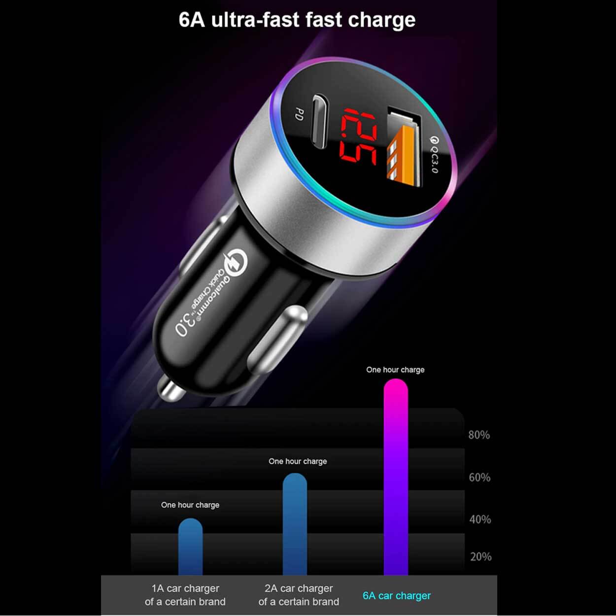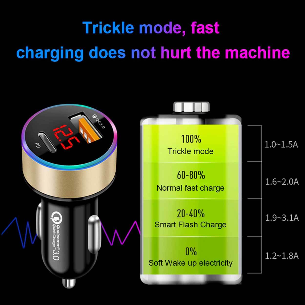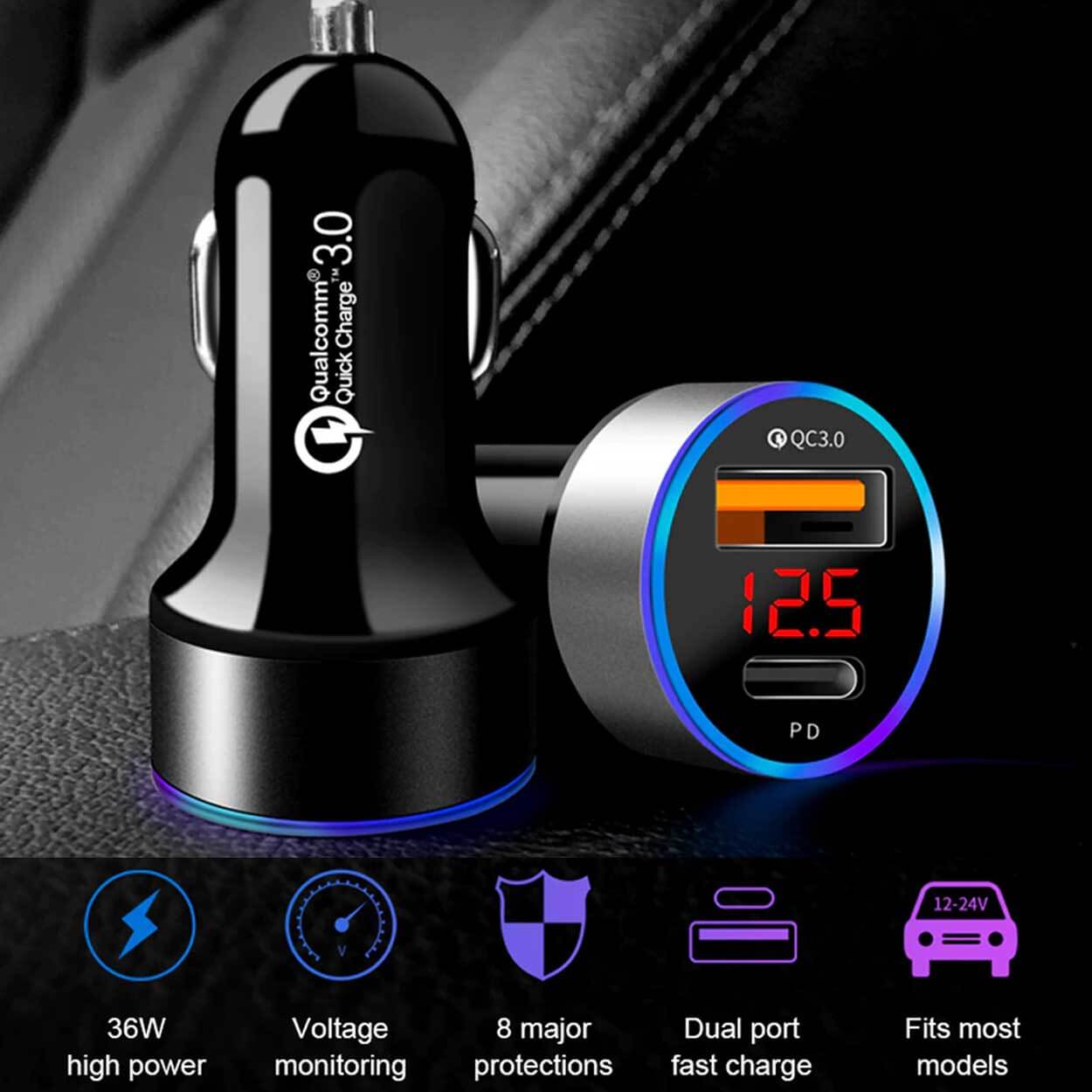 Billaddare för cigarettändaruttag med två snabba laddportar för mobil och annan USB-utrustning. USB-C-porten stödjer Power Delivery och USB-porten stödjer Quick Charge 3.0, vilket gör det möjligt att ladda två enheter samtidigt med upp till 36 W total effekt. Inbyggt överströmsskydd och intelligent chipset hjälper till att skydda anslutna enheter mot överladdning. LED-displayen visar bilbatteriets spänning för snabb kontroll under körning. Fungerar med vanliga laddkablar för iPhone och Android-enheter.