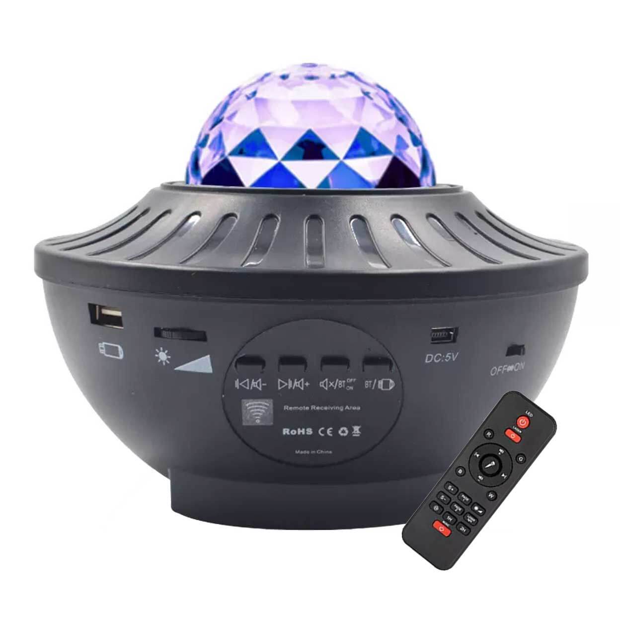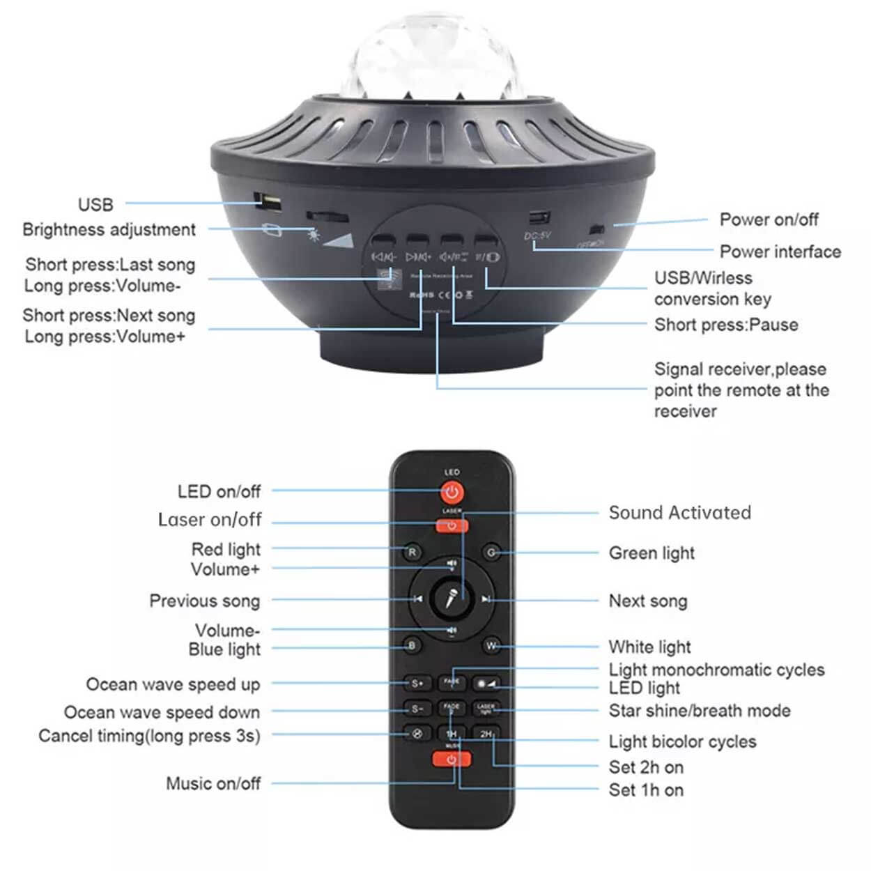 Stjärnprojektor som skapar en stjärnhimmel i taket och kan användas som nattlampa. Ljuset kan ställas i olika lägen och ljusstyrkor för att passa allt från avslappning till mjuk belysning vid läggdags. Inbyggd bluetooth-högtalare gör det möjligt att spela upp ljud trådlöst från mobil eller surfplatta. Lampan drivs via USB och kan anslutas till exempelvis väggladdare eller powerbank. USB-kabel, fjärrkontroll och bruksanvisning ingår.