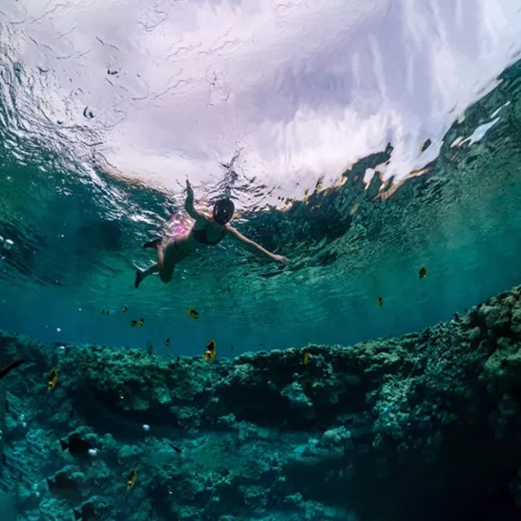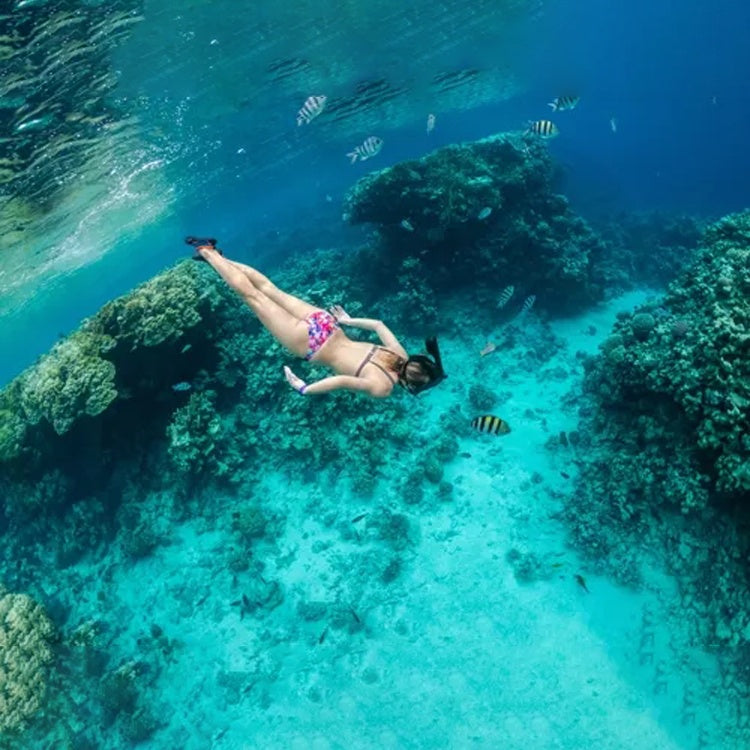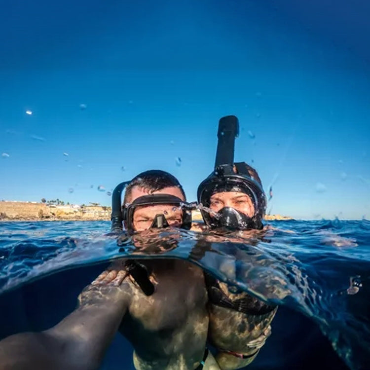 Heltäckande snorkelmask för snorkling och enklare dykning, utformad för att du ska kunna andas naturligt genom både näsa och mun. Masken ger 180 graders synfält för bättre överblick under vattnet och har anti-fog teknik som minskar imbildning. Torrtopp-systemet hjälper till att begränsa att vatten tränger in via snorkeln. Breda, justerbara remmar ger en stabil passform vid simning och vid hopp i vattnet. Förvaringsväska ingår för smidig transport och skydd mellan användningarna.