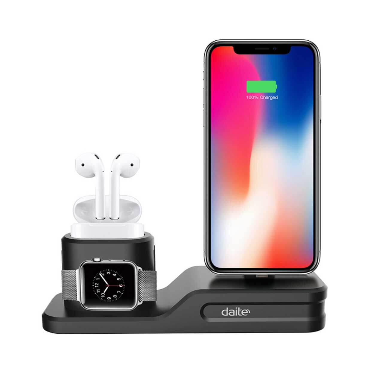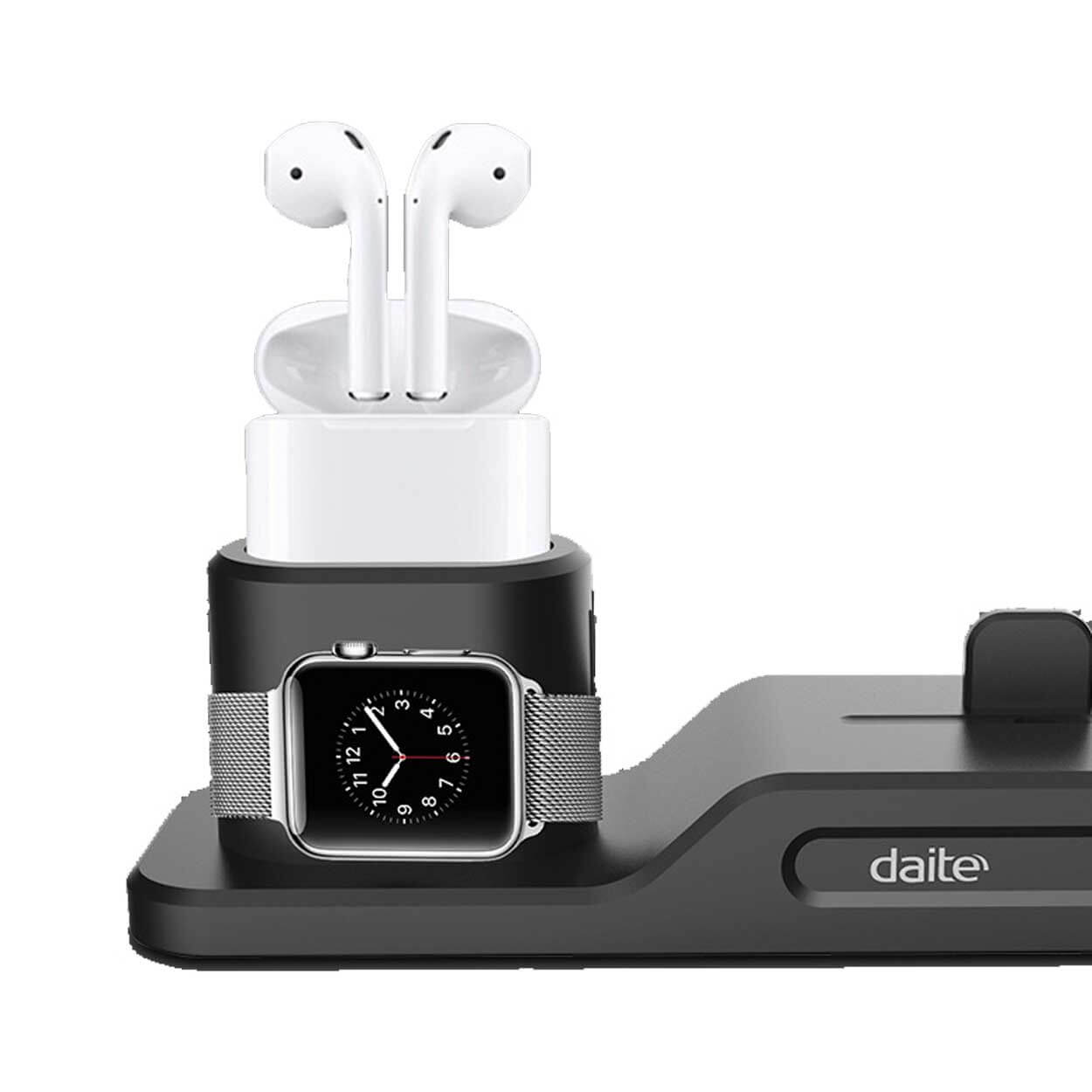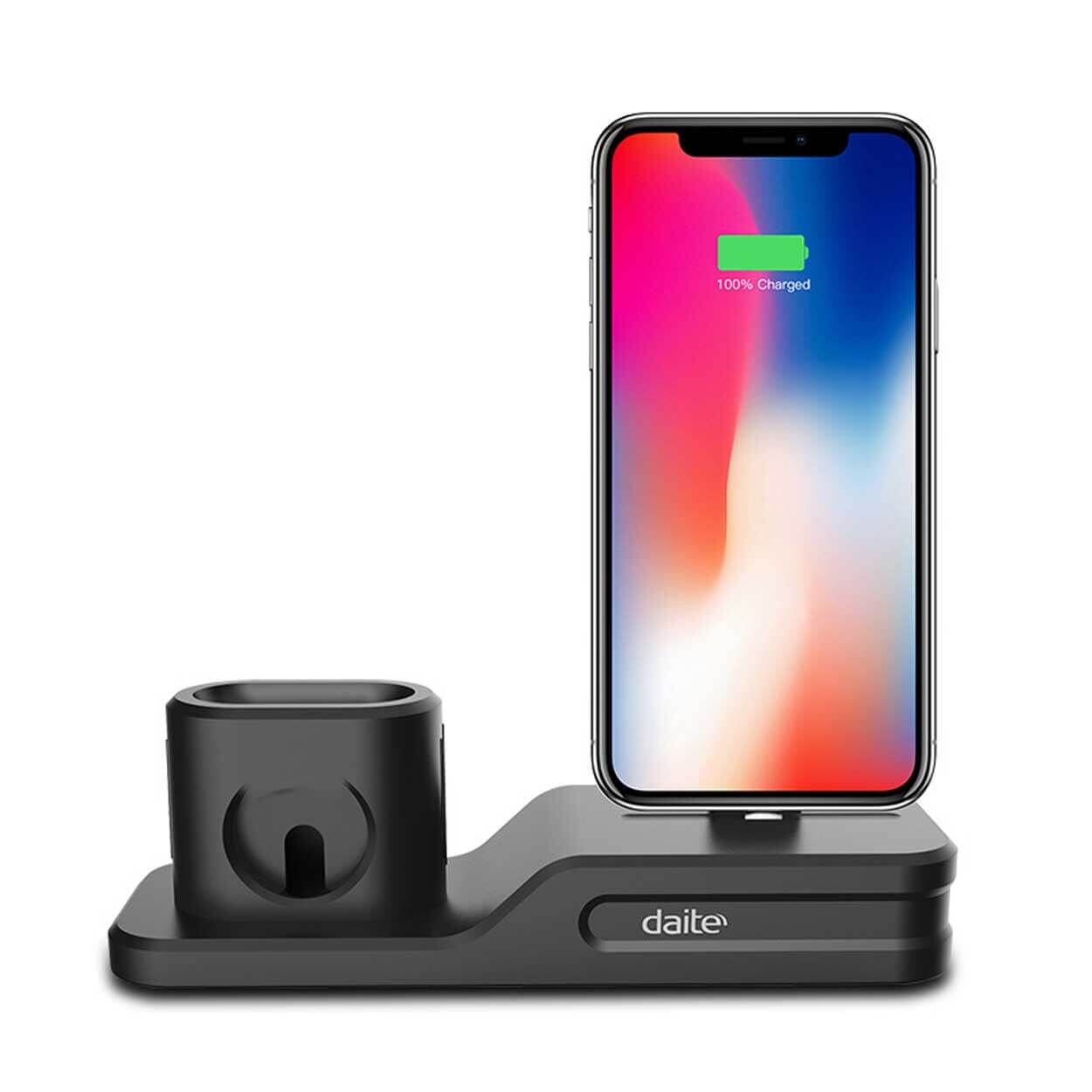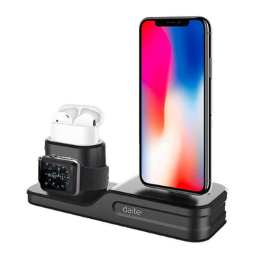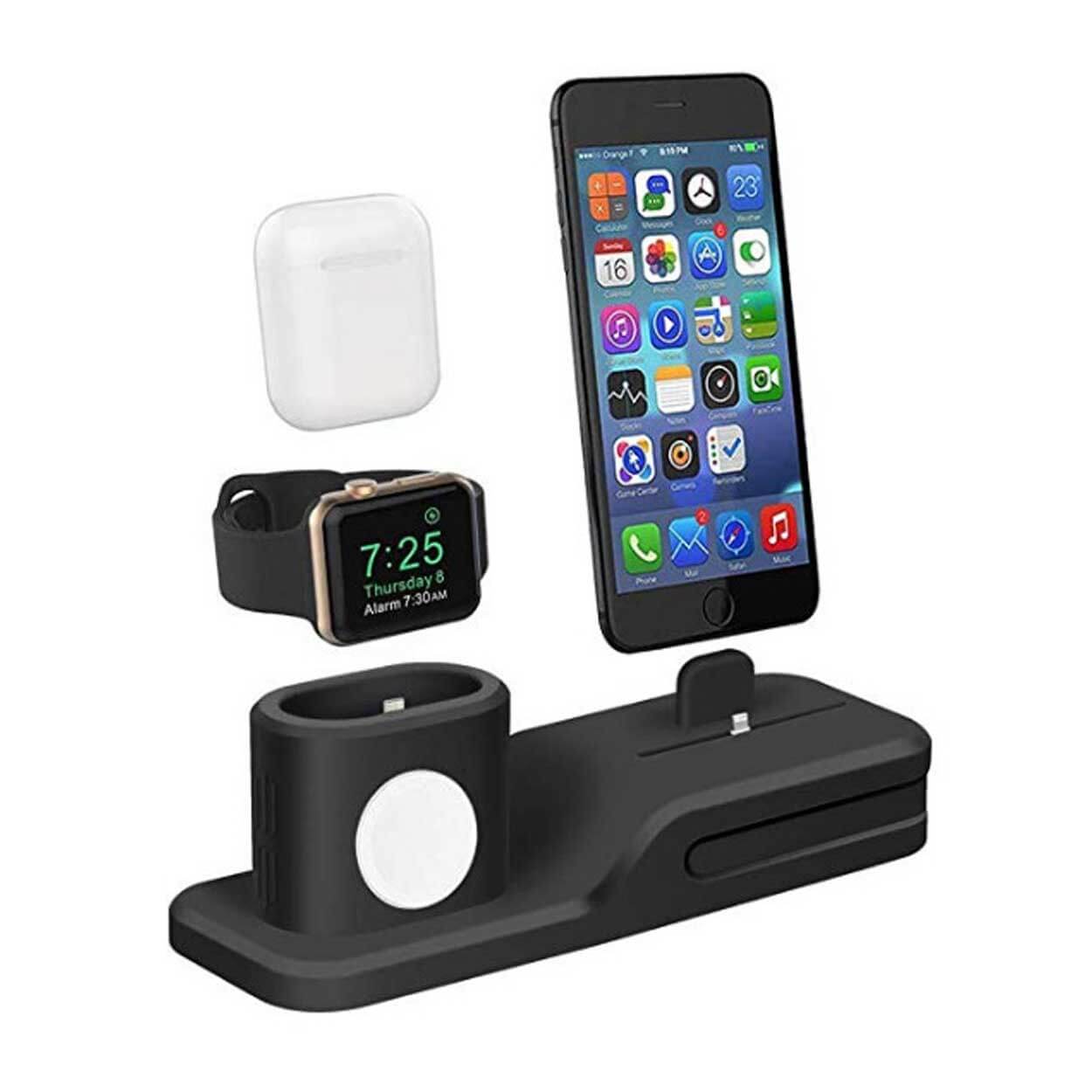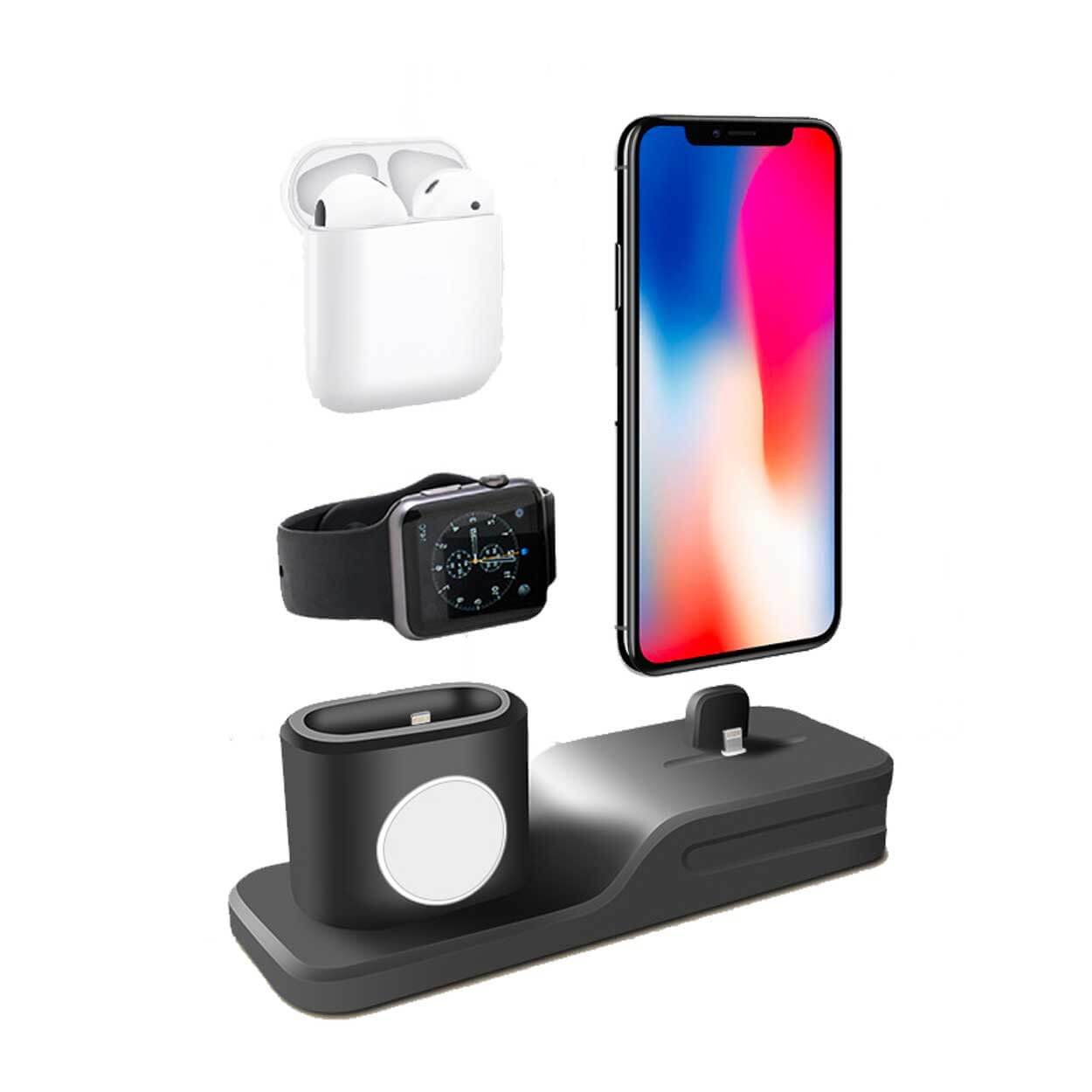 3-i-1 laddningsdocka som samlar iPhone, Apple Watch och AirPods på samma plats. Stället håller enheterna upprätt och gör det enkelt att ladda flera Apple-produkter samtidigt utan att sprida kablar över skrivbord eller nattduksbord. Konstruktionen i TPU ger ett greppvänligt stöd som hjälper dockan att stå stabilt och skyddar enheterna vid isättning. Kompatibel med iPhone 6/7/8 och Plus, iPhone X/XR/XS/XS Max, Apple Watch Series 1–4 samt AirPods 1–2. Laddare och kablar ingår inte.