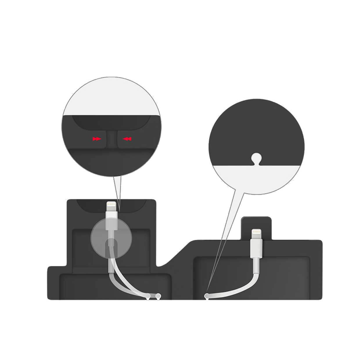 Dockan är avsedd att användas tillsammans med dina befintliga laddkablar och laddare, vilket gör den enkel att integrera i en befintlig Apple-laddningssetup. Placera kablarna i respektive hållare och låt enheterna vila i sina dedikerade positioner för en mer organiserad laddningsyta.