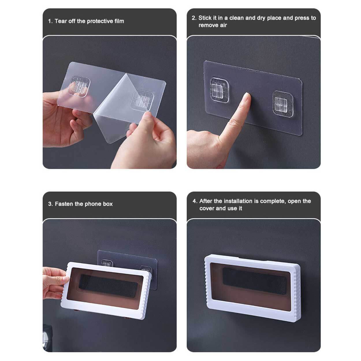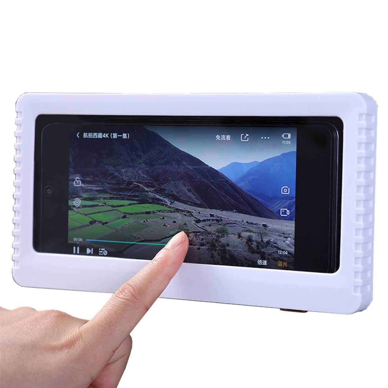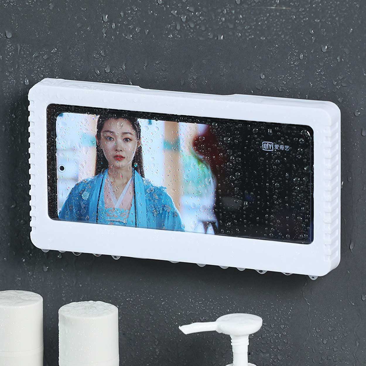 Vattentät mobilhållare som gör det möjligt att använda mobilen i dusch, badrum eller kök utan att utsätta den för vattenstänk. Telefonen placeras i hållaren och skärmen kan styras genom den transparenta plastfilmen, vilket gör det enkelt att byta video eller pausa musik. Universell storlek passar de flesta smartphones upp till 6,8 tum. En praktisk lösning för handsfree visning när du vill följa recept, titta på film eller använda appar i fuktiga miljöer.