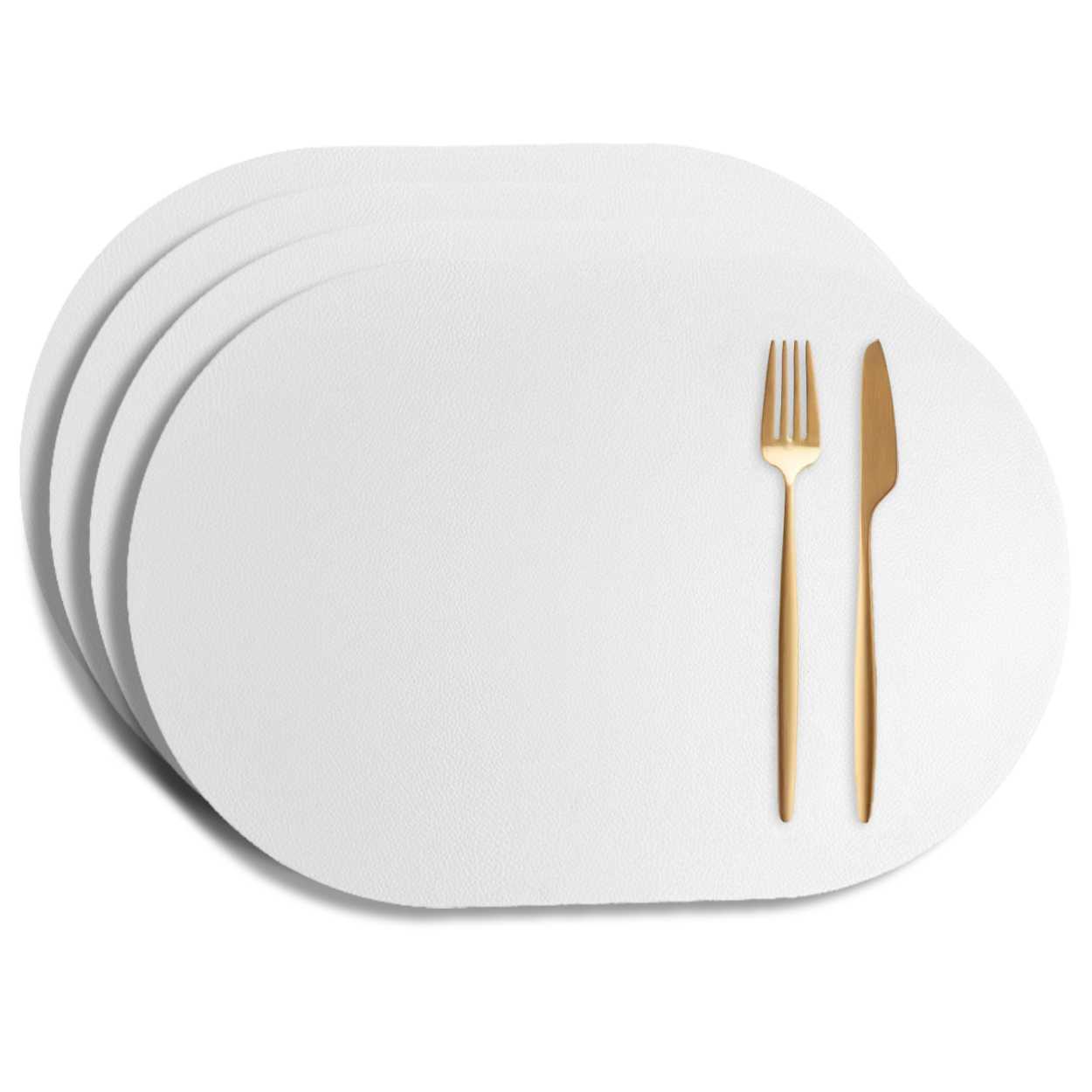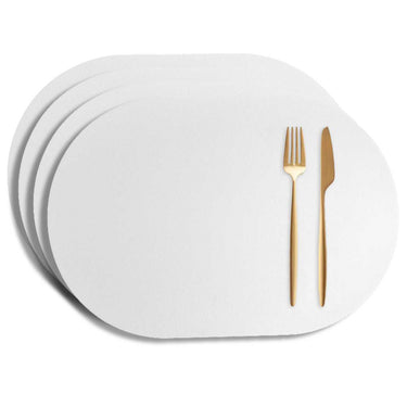 Ovala bordstabletter i konstläder som skyddar bordet mot repor, spill och fläckar vid vardagsdukning. Den smidiga ytan ger en stabil plats för tallrik, glas och bestick och hjälper till att hålla bordsskivan fräsch längre. Materialet är lätt att torka av efter måltiden, vilket gör underläggen praktiska både till frukost, lunch och middag. Formen passar de flesta bordsytor och ger en tydlig avgränsning för varje kuvert utan att ta onödigt mycket plats.