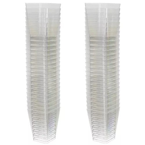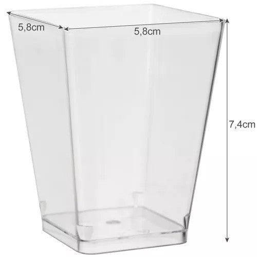 Dessertkoppar i plast som gör det enkelt att servera små portioner med ett rent och prydligt resultat. Volymen på 120 ml passar för mousse, pudding, gelé, glass och andra efterrätter, men även för aptitretare och små sallader. Den genomskinliga konstruktionen lyfter fram lager och dekorationer, vilket gör presentationen tydlig på buffé och vid servering. Formen är stapelbar för smidig hantering och förvaring. Kopparna kan även diskas i maskin när de ska användas igen.