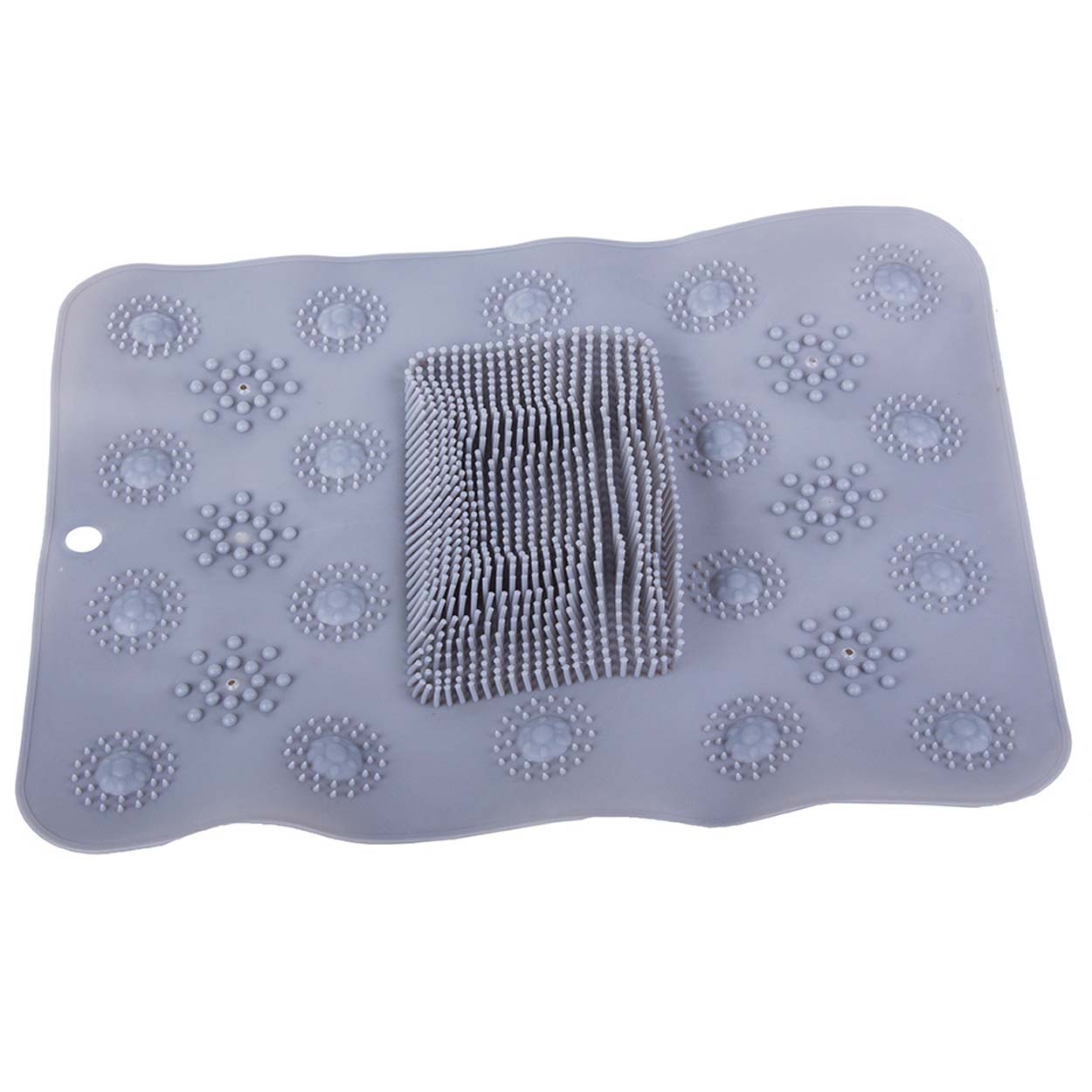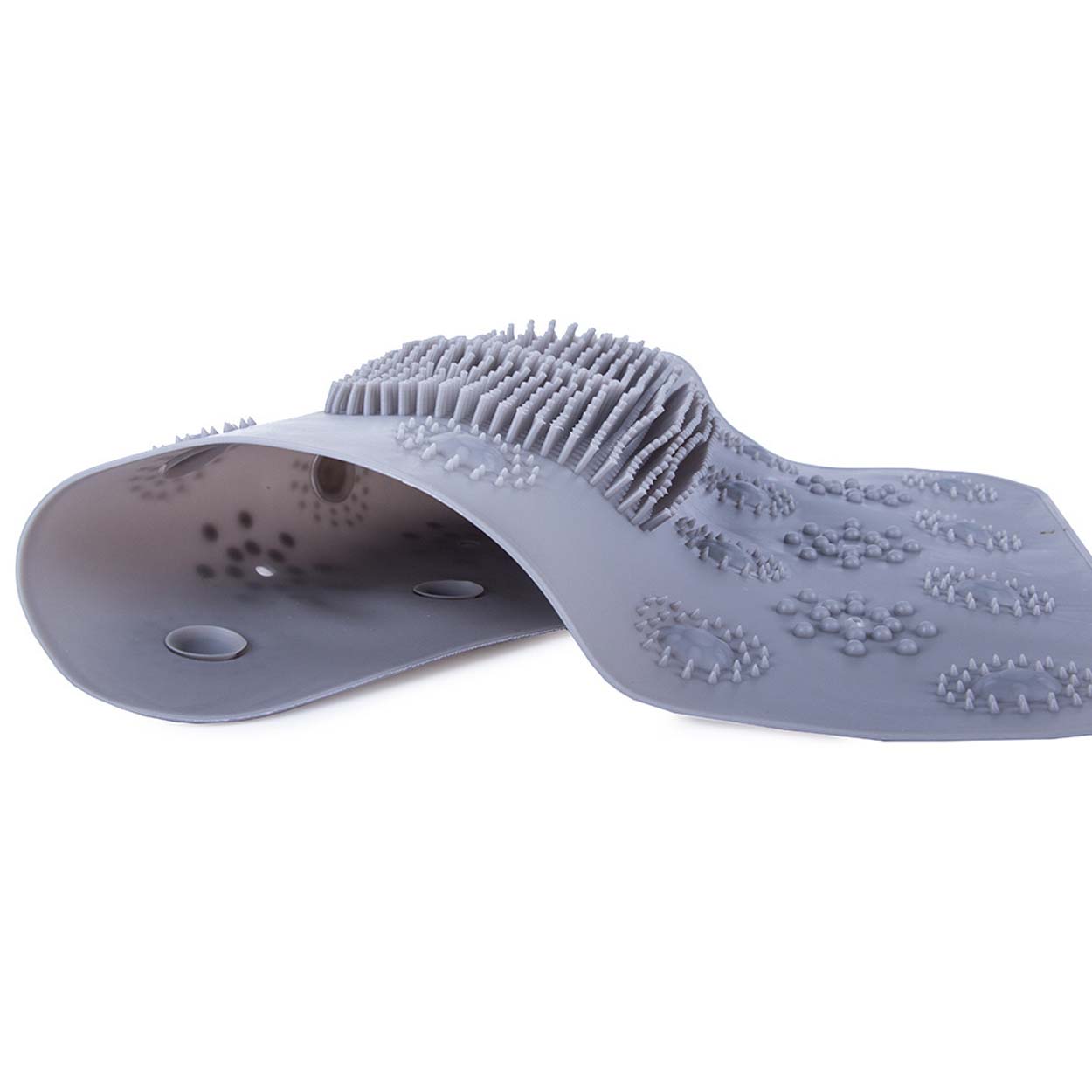 Duschmatta med fotskrubb som kombinerar halkskydd och fotrengöring i samma yta. De täta knopparna hjälper till att skrubba bort döda hudceller och rengöra mellan tårna när fötterna rör sig över mattan. Undersidan har sugkoppar som ger stabilt grepp på släta ytor och minskar risken att mattan glider i duschen. PVC-materialet är mjukt mot huden och enkelt att skölja av efter användning. Passar för daglig användning och kan vara extra praktisk för barn och äldre.