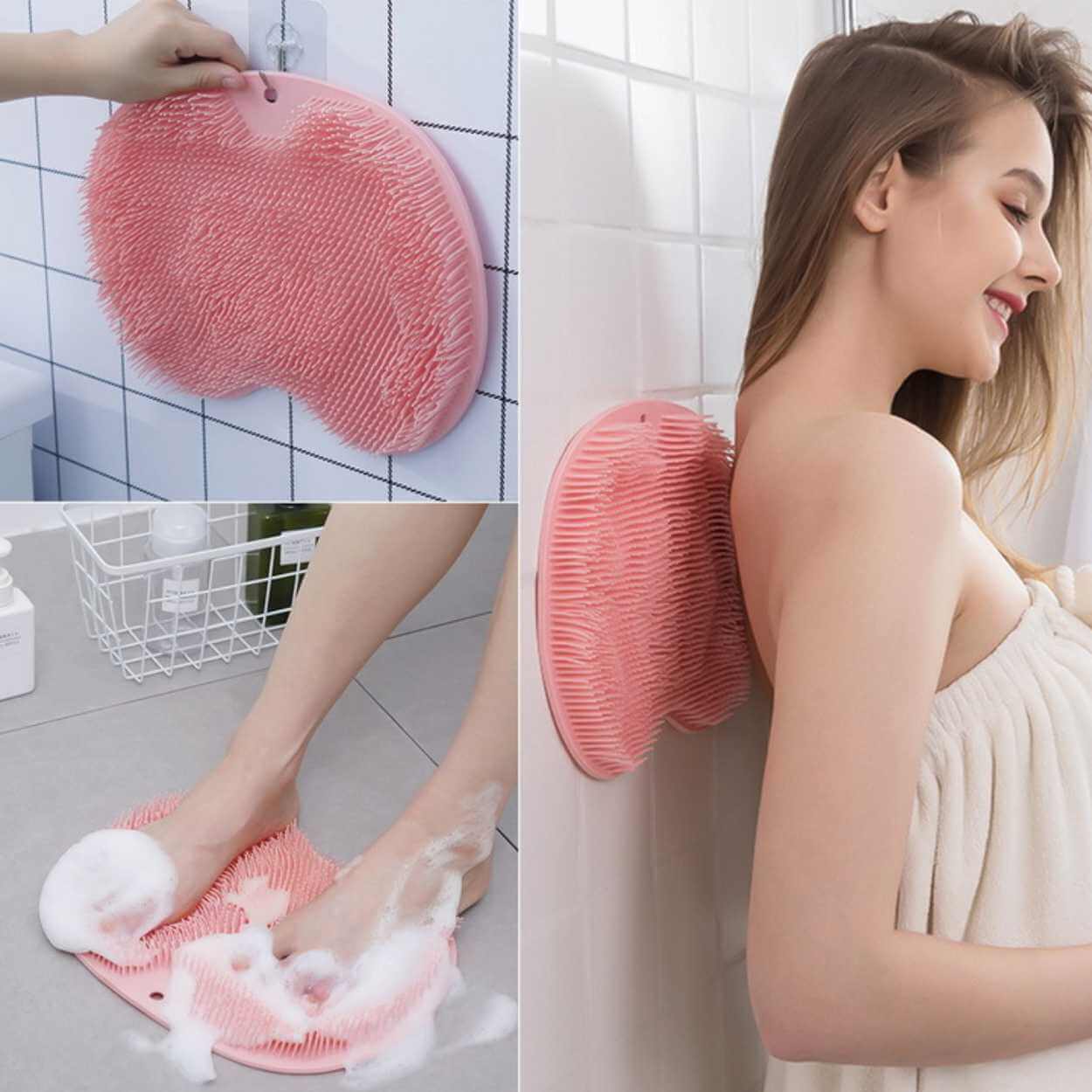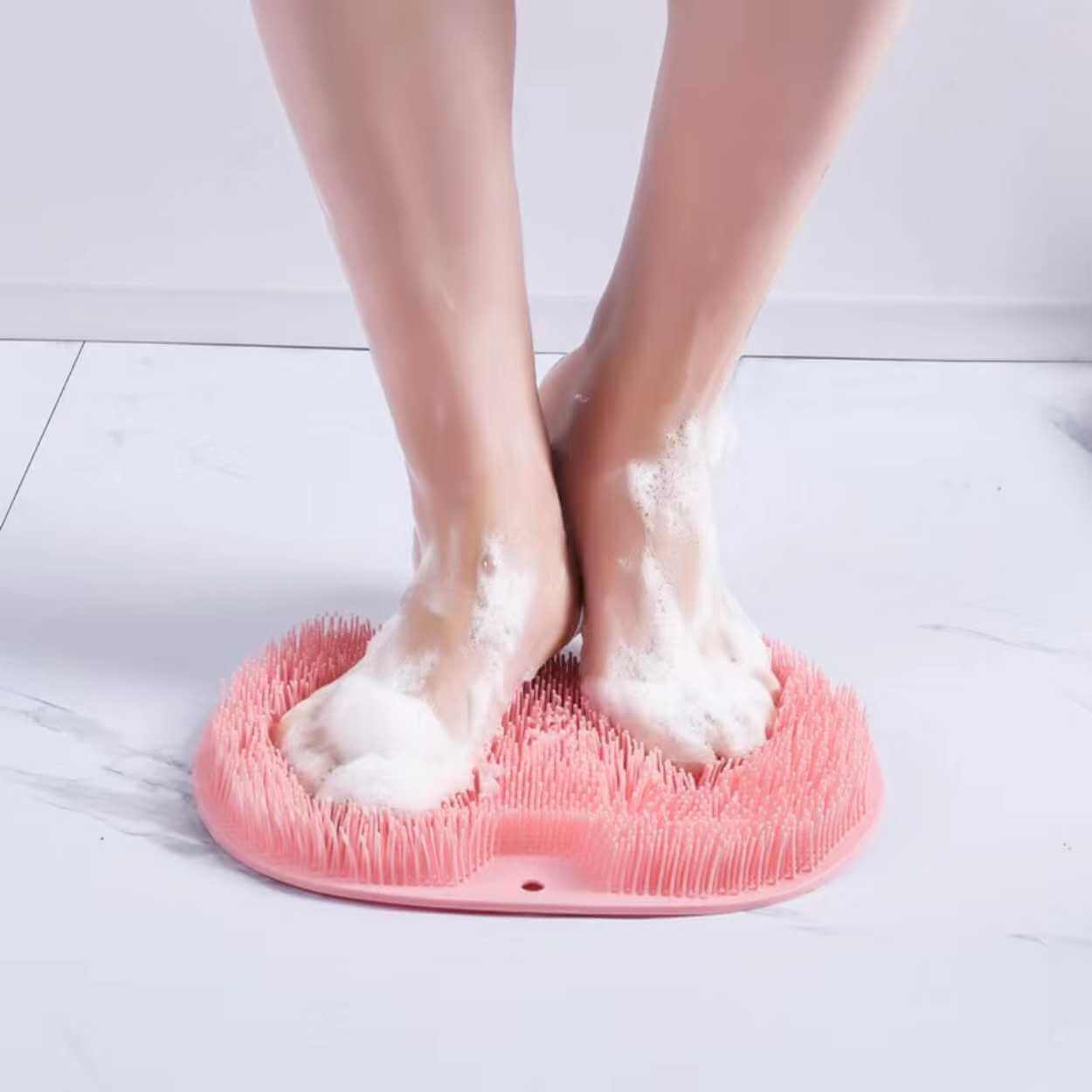 Skrubbmatta i silikon som används i dusch eller bad för att rengöra och exfoliera fötter, rygg och andra svåråtkomliga områden. Mjuka silikonborst hjälper till att avlägsna döda hudceller och smuts, vilket kan ge en jämnare och mjukare hudkänsla. Sugkoppar på undersidan gör att mattan sitter stabilt när den fästs på golv eller vägg, så att skrubb och fotmassage kan göras utan att den glider. Passar även för fotbad och kan underlätta hygien för personer med begränsad rörlighet.