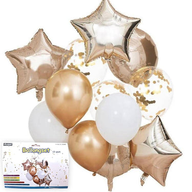Ballongset med en varierad mix av latexballonger och folieballonger för dekoration vid firanden. Uppsättningen gör det enkelt att bygga ballongbuketter eller ballongbågar och fungerar både inomhus och utomhus. Kombinationen av klassiska latexballonger och konfettifyllda ballonger ger mer liv i dekorationen, medan folieballongerna i runda och stjärnformade varianter skapar tydliga blickfång. Setet innehåller totalt 12 delar och passar bra när du vill få en enhetlig ballongdekoration utan att behöva plocka ihop olika typer separat.