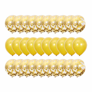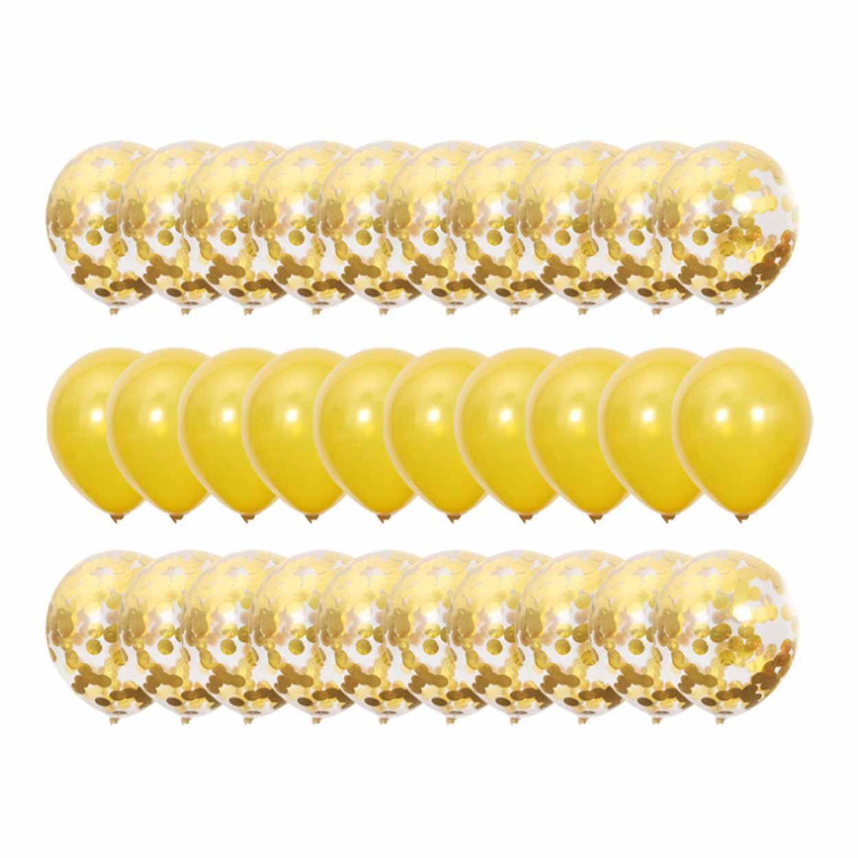 Konfettiballonger i 30-pack för dekoration vid fest och firanden. Setet innehåller 10 latexballonger och 20 konfettiballonger i 12-tums storlek, cirka 31 cm uppblåsta. Ballongerna kan fyllas med luft eller helium beroende på önskad effekt. Den töjbara latexen gör dem enklare att blåsa upp och knyta, och minskar risken för att de spricker vid hantering. Passar för att skapa ballongbuketter, bordsdekorationer eller som del av en större ballongvägg.