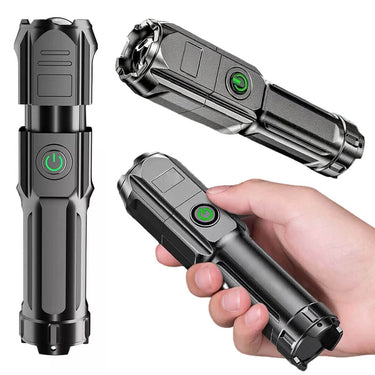Uppladdningsbar LED-ficklampa med teleskopisk zoom för att växla mellan bred ljusbild och mer fokuserad stråle. Lampan har tre lägen: hög, medium och SOS, vilket gör den användbar vid strömavbrott, arbete och utomhusaktiviteter. Ljusstyrkan anges till 1600 lumen och räckvidden till upp till 500 m. Drivs av ett uppladdningsbart 18650 litiumbatteri på 1200 mAh och laddas via micro-USB. Regntålig konstruktion för användning i dåligt väder.
