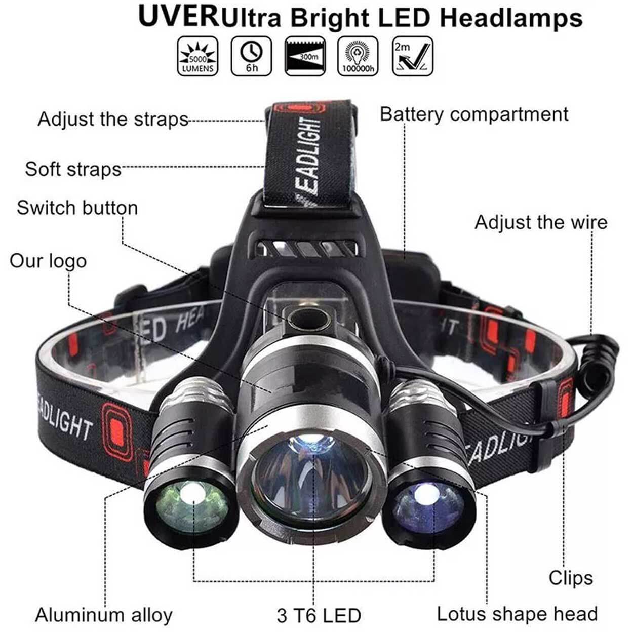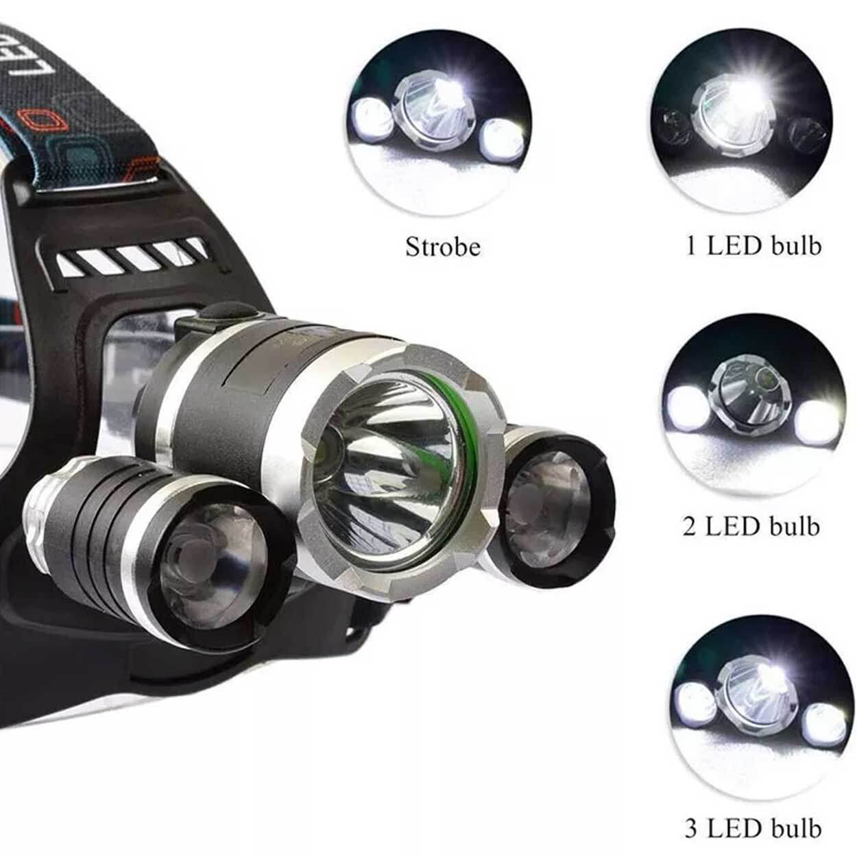 Uppladdningsbar LED-pannlampa med tre ljuskällor för arbete och friluftsaktiviteter. Kombinationen CREE T6 och två XPE ger upp till 1000 lumen och fyra lägen: fokus, diffus, starkt ljus samt SOS. Lamphuset kan vinklas 180° för att rikta ljuset dit det behövs, och den justerbara huvudremmen ger stabil passform. På baksidan sitter en röd varningslampa som lyser under användning för bättre synlighet. Laddning sker via USB och drifttiden är cirka 3–5 timmar per laddning.
