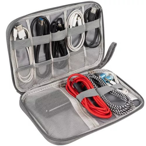 Kabelorganisatör som samlar kablar, laddare och små elektroniktillbehör i en kompakt förvaringsväska. Utsidan i slitstark polyester står emot vattenstänk och är lätt att torka av. Insidan har skumskydd som hjälper till att skydda innehållet i väskan eller ryggsäcken. Elastiska band håller kablar på plats och meshfickor ger snabb överblick över adaptrar och hörlurar. Dragkedjan stänger säkert och handtaget gör den smidig att bära vid resa, pendling eller på kontoret.