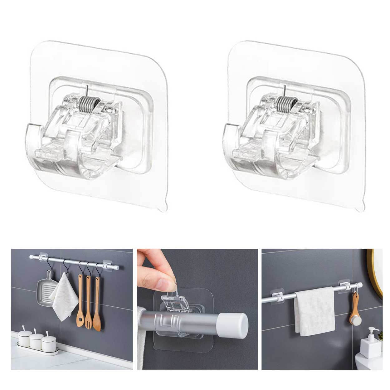 Självhäftande hållare för gardinstång och andra stänger som ger snabb montering utan borrning. Fästet har en 3M självhäftande yta som gör att hållarna kan monteras på släta underlag utan skruvar eller spik. Passar för upphängning och organisering i flera rum, exempelvis vid fönster, i kök eller i badrum. Konstruktionen är avsedd för lättare belastning och klarar upp till 5 kg, vilket gör den lämplig för enklare gardinlösningar och liknande användning.