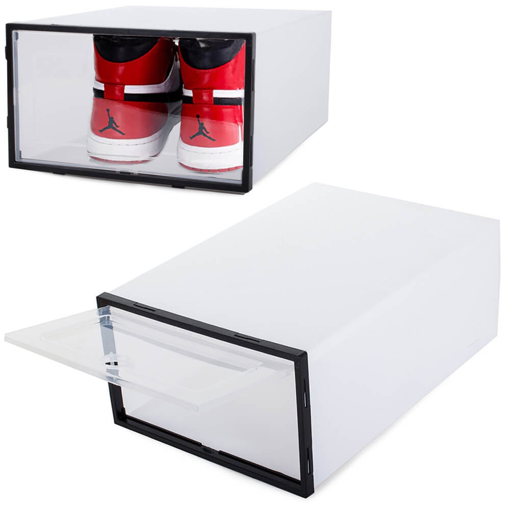 Transparenta skolådor som gör det enkelt att organisera och hitta rätt par direkt. Lådorna är stapelbara och kan kombineras modulärt med fästen, vilket ger flexibel förvaring i garderob eller klädrum. Ventilationshål hjälper luften att cirkulera vid längre förvaring och minskar risken för instängd lukt. Konstruktionen kan fällas ihop när den inte används för att spara plats. Utöver skor fungerar lådorna även för mindre saker som mössor, halsdukar, smycken, kosmetika och leksaker.