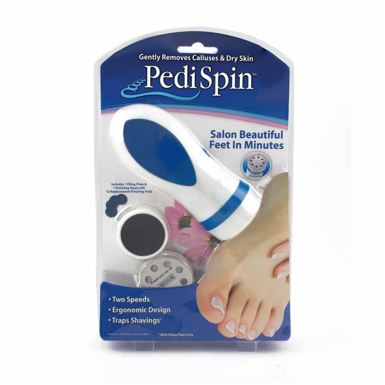 Elektronisk fotfil som effektivt avlägsnar förhårdnader och döda hudceller för mjukare och jämnare fötter. Två hastigheter gör det enkelt att anpassa behandlingen efter hur hård huden är, från grov avverkning till finare finish. Greppvänlig, ergonomisk form ger stabil kontroll vid användning. Fotfilen drivs av 4 AA-batterier, vilket ger sladdfri hantering och gör den enkel att använda hemma. Levereras med grov fil, avslutningsfil och 12 utbytbara filplattor för smidigt byte.