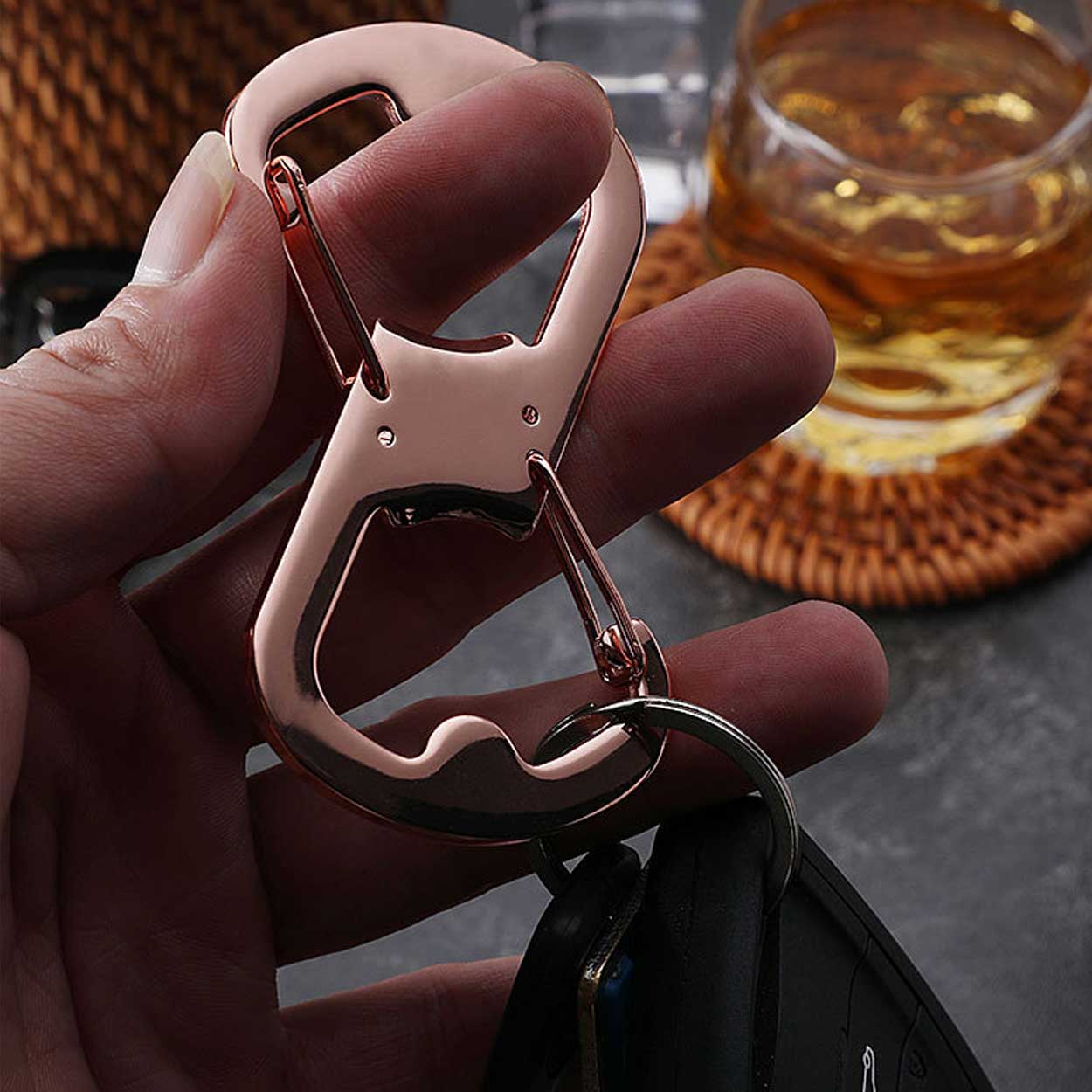 Karbinhake som fungerar som nyckelring och kapsylöppnare. Dubbla öppningar gör det enkelt att koppla på och av nycklar utan att krångla, oavsett om den sitter i en bältesögla eller på en väska. Båda sidorna kan användas som flasköppnare, vilket ger en praktisk extrafunktion utan att ta mer plats. Metallkonstruktionen ger en robust känsla och passar för daglig användning när nycklar behöver sitta säkert men ändå vara snabba att komma åt.