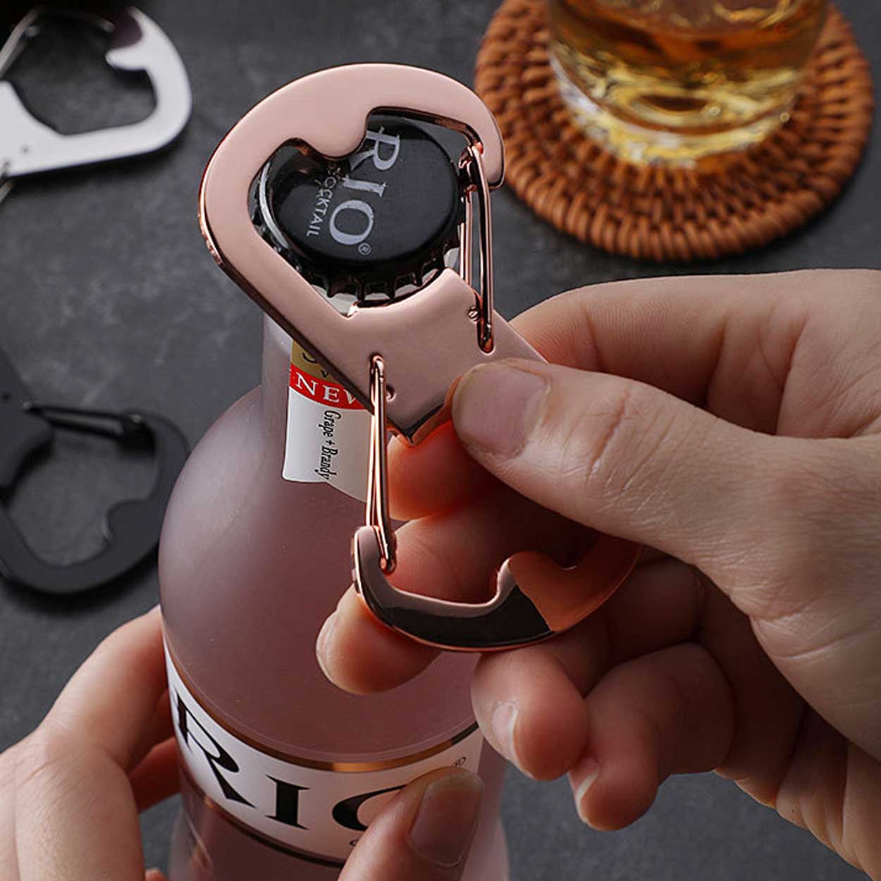Öppningsfunktionen är integrerad i karbinhakens form, så kapsylöppnaren finns tillgänglig utan extra verktyg eller lösa delar. Den dubbla öppningen gör att nycklar kan flyttas mellan fästen utan att hela nyckelknippan behöver tas loss, vilket minskar risken att tappa nycklar vid hantering.