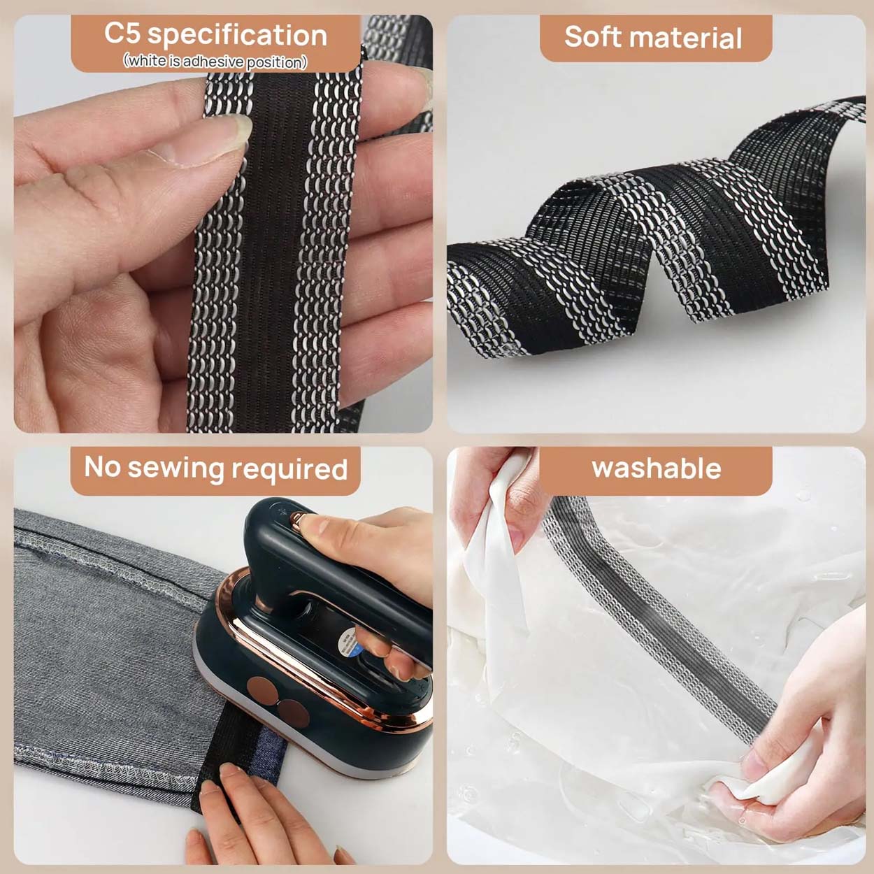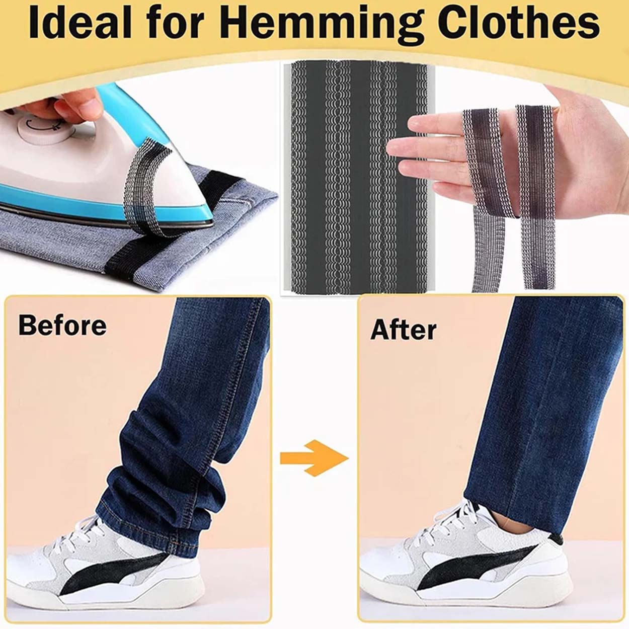 För bästa fäste bör tyget vara rent och torrt. Pressa med strykjärn enligt tygets värmetålighet och arbeta med jämnt tryck längs hela fållen. Låt fogen svalna innan plagget används eller belastas. Testa gärna på en liten yta först på känsliga material.