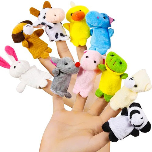 Set med 10 fingerdockor i djurtema för teaterlek och berättande. Dockorna är tillverkade i mjuka textilmaterial som känns behagliga i handen och gör dem enkla att använda under längre lekstunder. Formatet passar små barnhänder och fungerar även för mindre vuxenfingrar, vilket gör det smidigt vid gemensam lek och sagostunder. Fingerdockor kan användas för att öva ord, dialog och turtagning samt stimulera finmotorik när barnet rör och placerar dockorna på fingrarna.