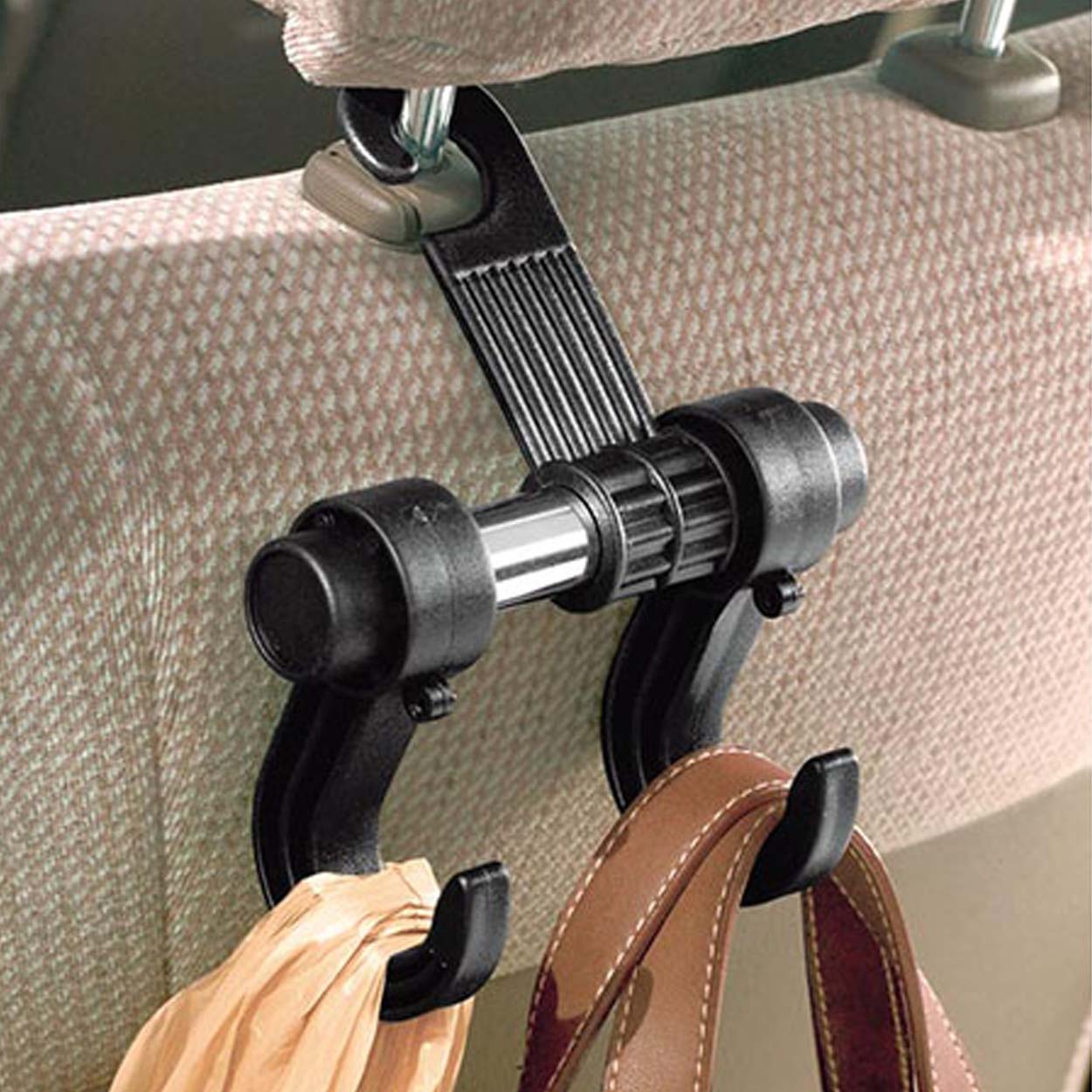 Krokar för bilnackstöd som hjälper till att hålla ordning i kupén genom att hänga upp kassar, väskor och andra föremål från sätets nackstöd. Konstruktionen ger två krokar som gör det enkelt att separera och stabilisera lasten så att den inte glider runt på golvet. Monteringen sker utan verktyg och krokarna kan justeras efter behov. När de inte används tar de liten plats och kan förvaras i handskfacket.