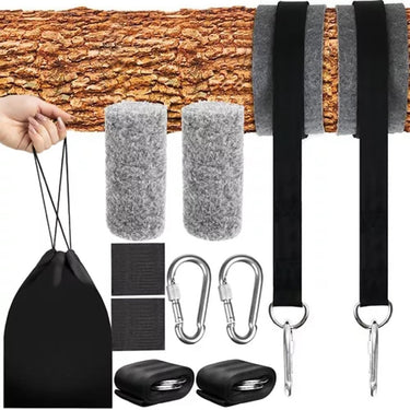Monteringskit för upphängning av hängmatta, hammock, gunga eller brasiliansk stol. Kitet ger en snabb och stabil montering utan verktyg eller borrning, vilket gör det smidigt att använda både i trädgård och på utflykt. Två slitstarka nylonband fästs runt träd eller annan lämplig infästning och kombineras med två karbinhakar i metall för enkel koppling. Två skyddsdynor hjälper till att minska slitage mot underlaget. Allt förvaras i medföljande påse för enkel transport och ordning.