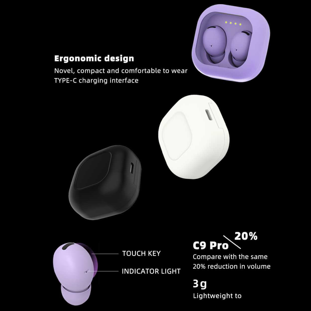 C9 Pro är trådlösa TWS-hörlurar för musik och handsfree-samtal i vardagen. Bluetooth 5.3 ger en snabb och stabil anslutning, och automatisk parkoppling gör att de kopplar upp när de tas ur laddningsfodralet. Knappstyrning på hörlurarna gör det enkelt att hantera play/pause, spårbyte och samtal utan att ta upp mobilen. IPX5-klassning ger skydd mot svett och lätt regn. Hörlurarna kan användas var för sig eller som ett par, beroende på behov.