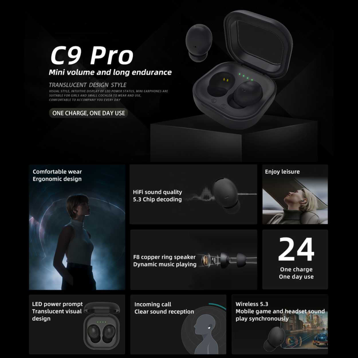 C9 Pro är trådlösa TWS-hörlurar med bluetooth 5.3 för snabb och stabil anslutning till mobil, surfplatta eller dator. Automatisk parkoppling gör att de ansluter direkt när de tas ur laddningsfodralet. Enknappskontrollen ger enkel styrning av uppspelning, spårbyte och handsfree-samtal. IPX5-klassningen gör dem praktiska vid träning och i fuktiga miljöer. Speltiden ligger på cirka 5–8 timmar per laddning, och fodralet laddar hörlurarna mellan användningarna.
