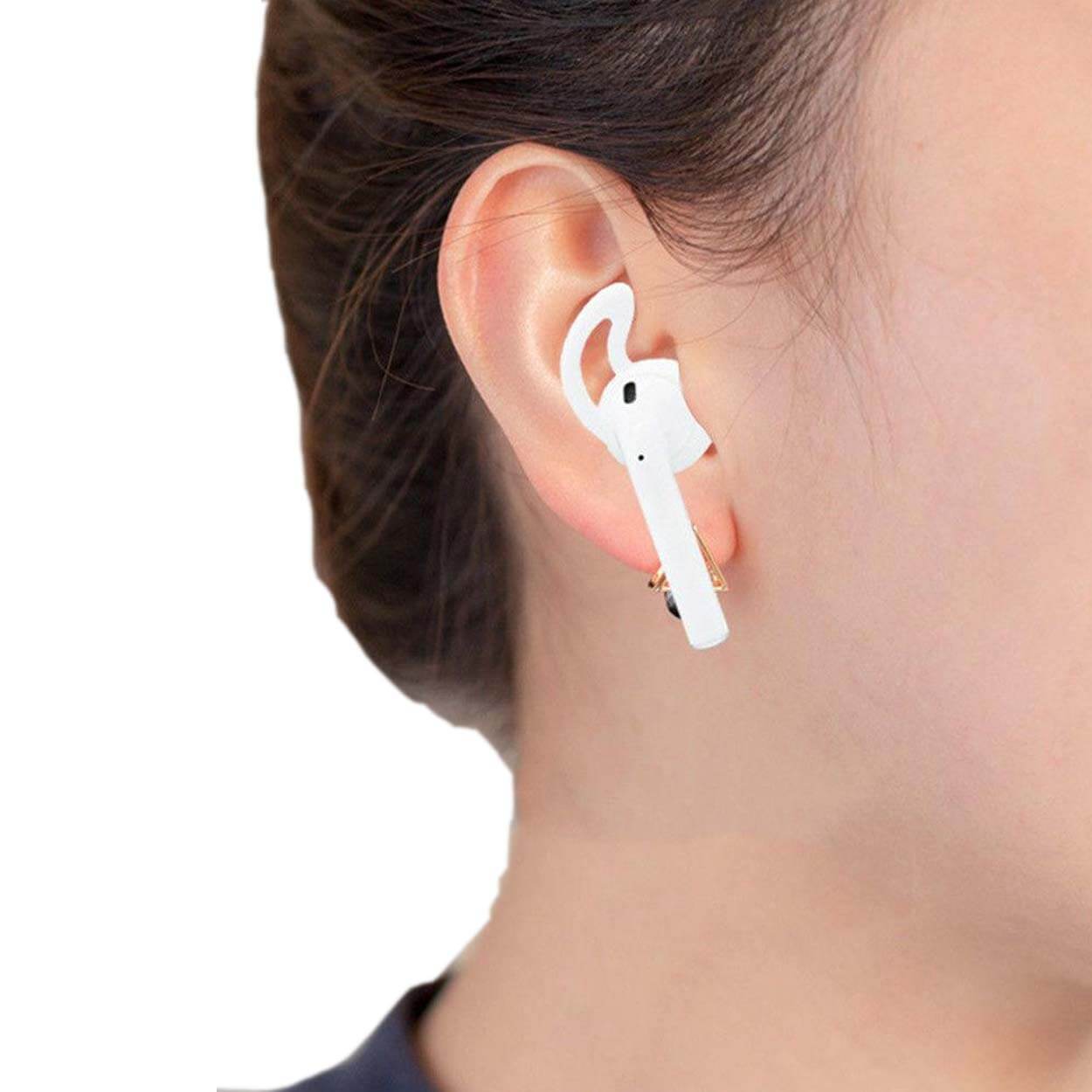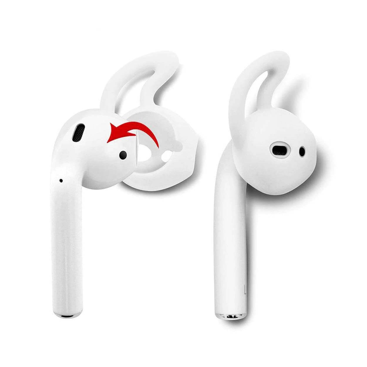 AirPods-örontoppar i silikon med integrerad krok som hjälper hörlurarna att sitta säkrare i örat vid rörelse. Passformen blir stabilare under träning och löpning, vilket minskar risken att de glider ur. Silikonet bidrar även till att dämpa omgivningsljud så att musiken upplevs tydligare, särskilt i basregistret. Örontopparna är enkla att montera och ta av vid behov. Kompatibla med AirPods 1 och 2 samt Apple EarPods.