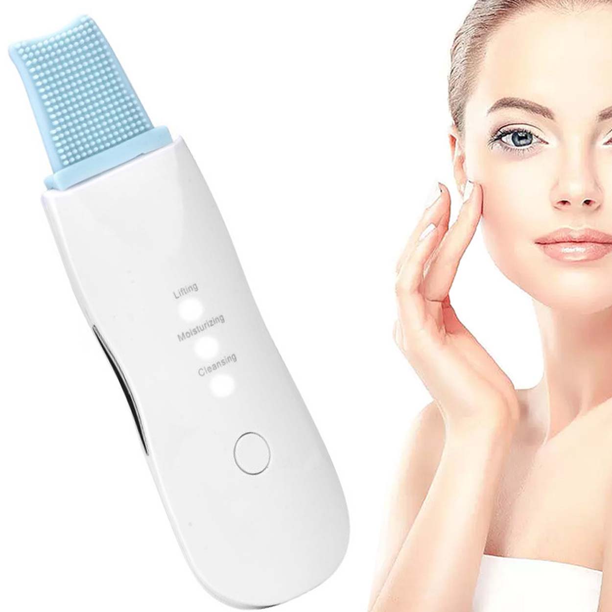 Ultraljudsskrubber för ansiktet som ger skonsam men effektiv djuprengöring hemma. Verktyget använder ultraljud och kavitation för att lyfta bort överflödig talg, döda hudceller och orenheter från hudytan. Tre lägen gör det enkelt att anpassa rutinen: rengöring för peeling, återfuktning tillsammans med ansiktsvatten och ett lyftläge för en fastare känsla. Enheten laddas via USB och kabel ingår. Två silikonpads medföljer för rengöring och massage som kompletterar behandlingen.