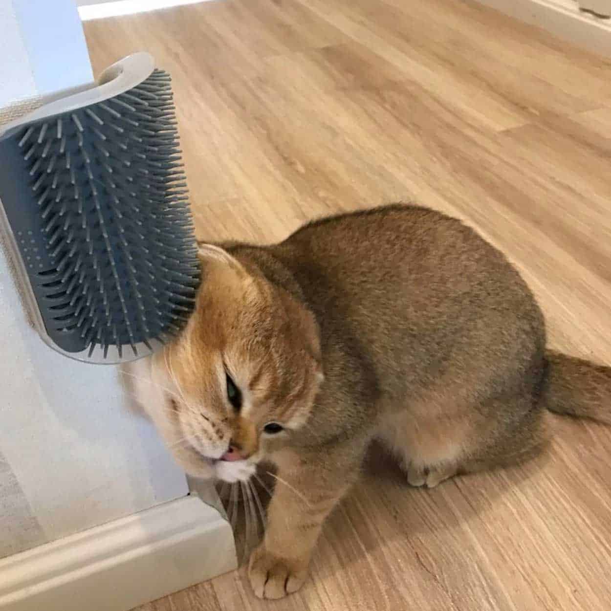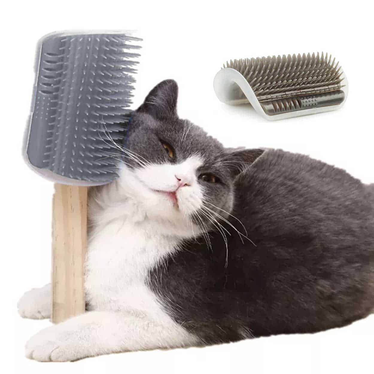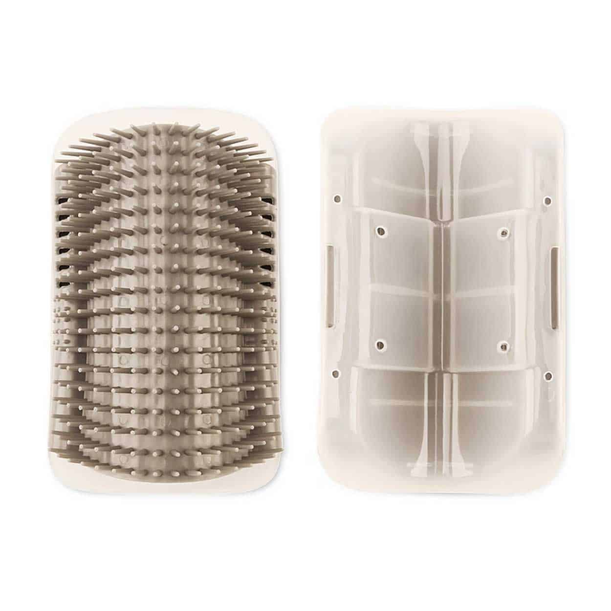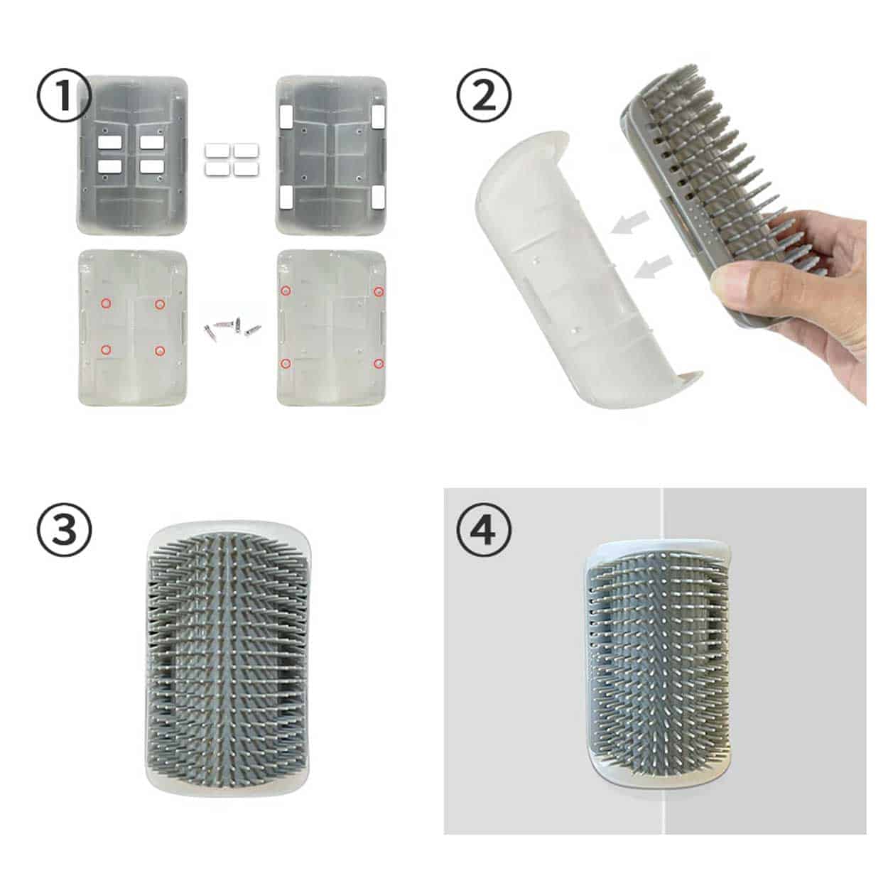 Hörnmonterad kattborste som låter katten klia och massera sig själv när den vill. Borsten fästs i ett hörn på vägg eller möbel i kattens höjd och hjälper samtidigt till att avlägsna lösa hårstrån. Pälsen samlas på borsten så att den blir enklare att plocka bort och hålla rent runt favoritplatserna. Montering kan göras med självhäftande tejp eller skruvar, vilket gör den lätt att placera på flera typer av ytor som skåp, bordsben och väggar.