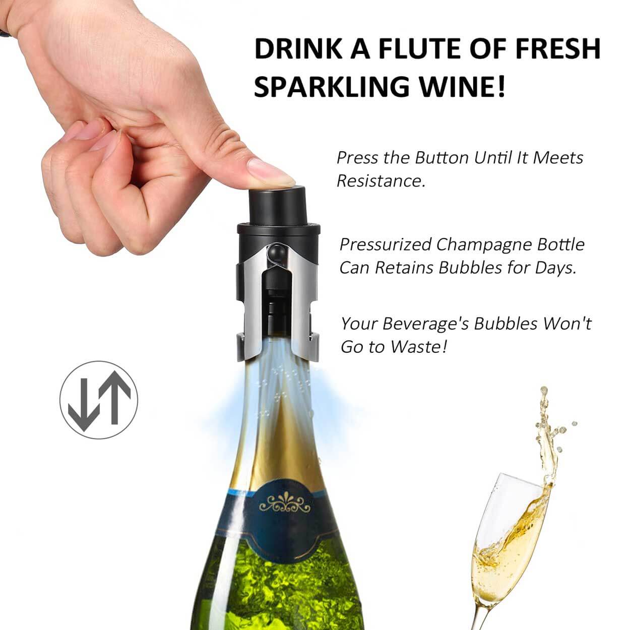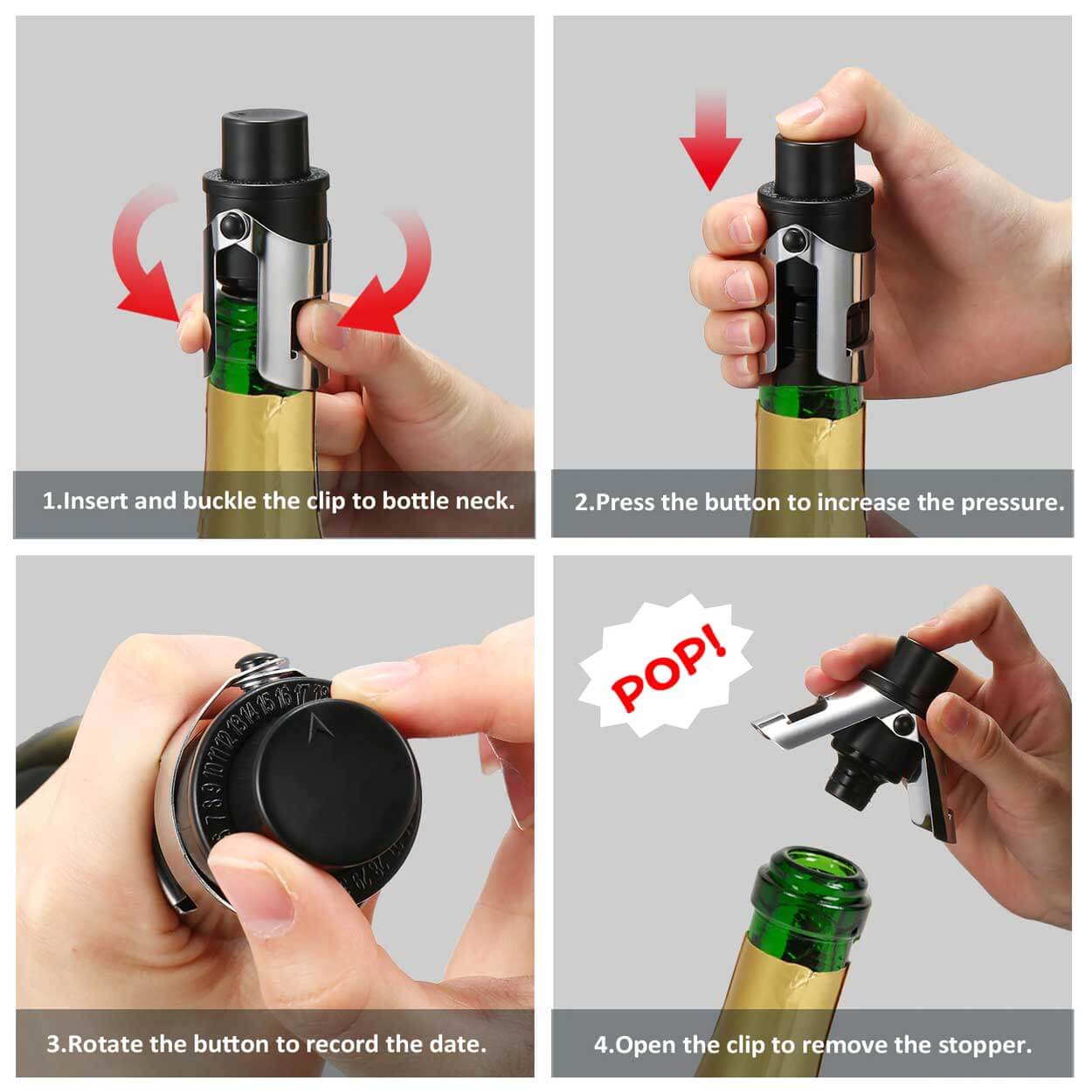 Vakuumkork för champagne och andra bubbel som hjälper till att behålla kolsyran efter öppning. Sätt förslutaren på flaskan och pumpa tills motstånd känns, så skapas ett vakuum som minskar att bubblorna försvinner. Den vridbara datummarkeringen gör det enkelt att komma ihåg när flaskan öppnades. Konstruktionen i rostfritt stål kombinerat med livsmedelsklassad silikon ger en tät och tålig förslutning för champagne, cava, prosecco och liknande drycker.