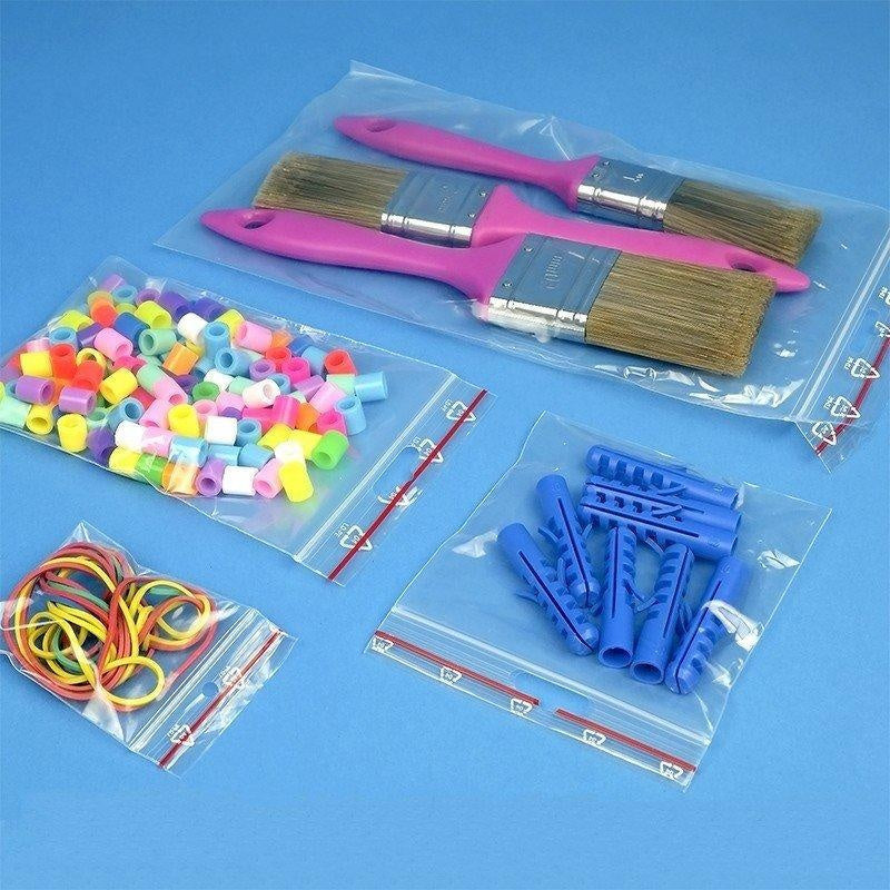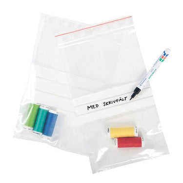 Återförslutningsbara ziplockpåsar med skrivfält som gör det enkelt att märka upp och organisera småsaker. Passar för förvaring av exempelvis skruvar, pärlor, reservdelar och andra småprylar, men fungerar även för livsmedel tack vare livsmedelsgodkänd polyeten. Blixtlåsförslutningen ger snabb åtkomst och påsen kan även värmesvetsas för en mer permanent stängning. Upphängningshål gör det smidigt att förvara påsarna på krok eller ställ när innehållet behöver vara lättillgängligt.