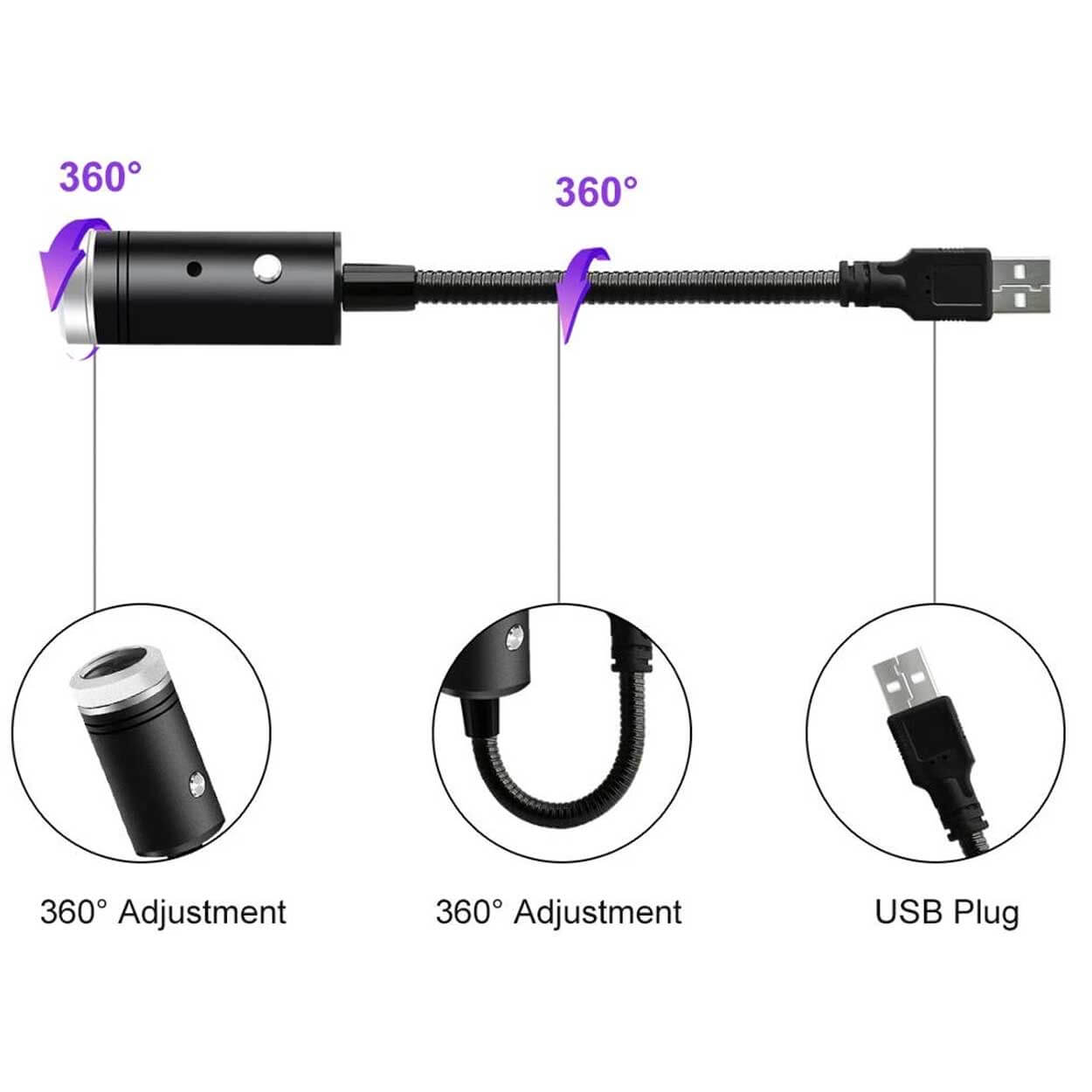 Galaxy projektor för bilen som ansluts via USB och projicerar en stjärnlik ljuseffekt i taket. Lampan riktas enkelt för att få ljusbilden där den gör mest nytta, och effekten kan ändras genom att vrida på huvudet. Passar för dig som vill ha stämningsbelysning i kupén utan fast installation. Anslut i bilens USB-uttag eller annan USB-strömkälla och justera vinkeln tills projektionen hamnar rätt.