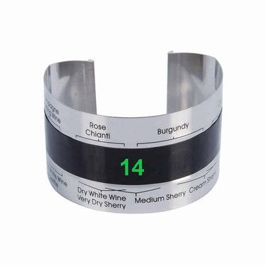 Vintermometer för vinflaska som hjälper till att servera vin vid rätt temperatur. Termometern fästs runt flaskan och visar aktuell temperatur i intervallet 4–24 °C. Skalan anger även rekommenderade temperaturintervall för olika vintyper, vilket gör det enkelt att kyla eller temperera vinet till önskat läge. Konstruktionen i rostfritt stål är tålig och kräver inga batterier, så den kan användas direkt vid varje servering. Det kompakta formatet gör den smidig att förvara i kökslådan eller ta med.