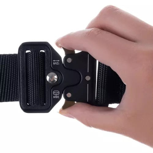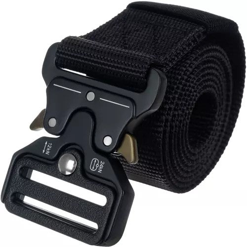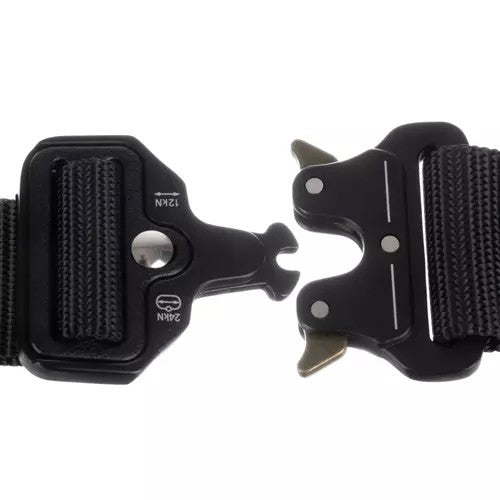 Taktiskt bälte i militärstil med steglös justering utan hål för snabb och exakt passform. QR-spännet gör att bältet kan spännas eller lossas direkt, vilket passar både vardag och utrustningsbärande aktiviteter. Nylonbandet är gjort för att tåla slitage och ger stabilt stöd för exempelvis multiverktyg, ficklampa eller hölster. Spännet är förstärkt med zinklegering och aluminium och är specificerat för 12 kN lastkapacitet i öppet läge och 24 kN i stängt läge.
