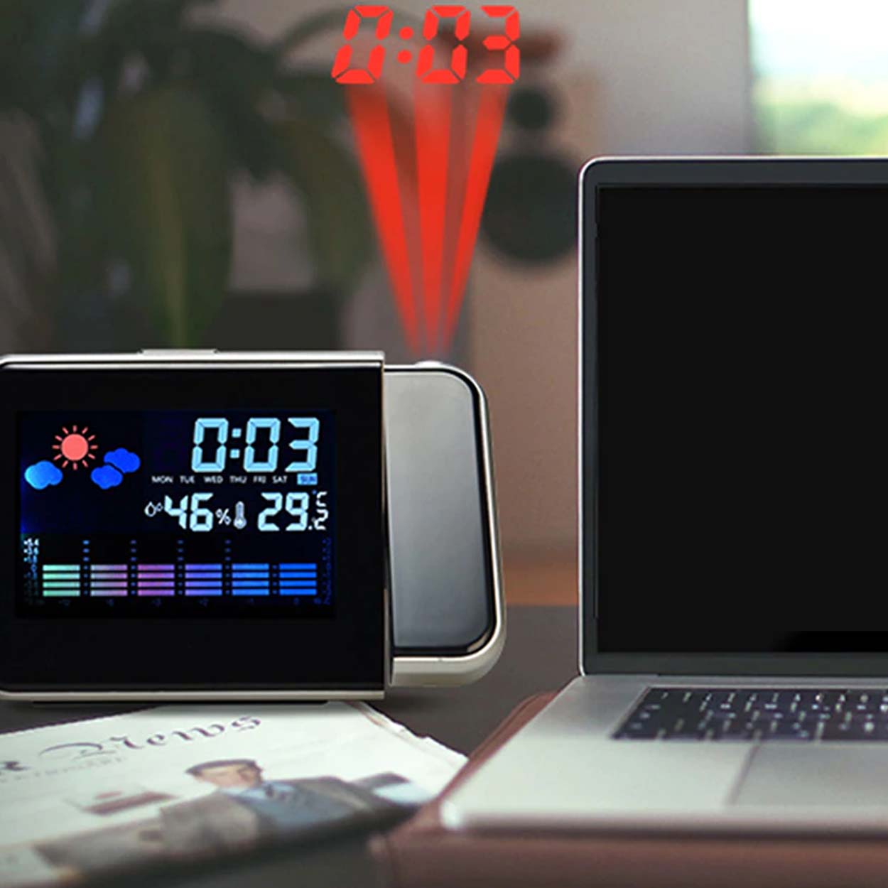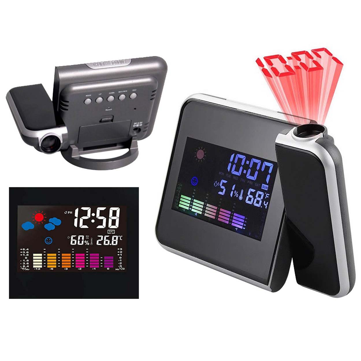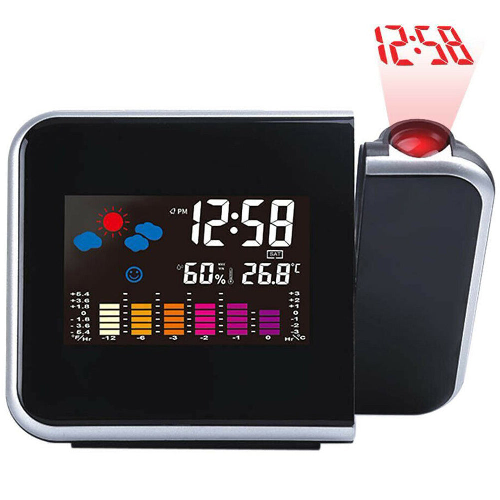 Väderstation / hygrometer / projektorklocka – inomhusklimat, tid – färg LCD, 12/24 h
