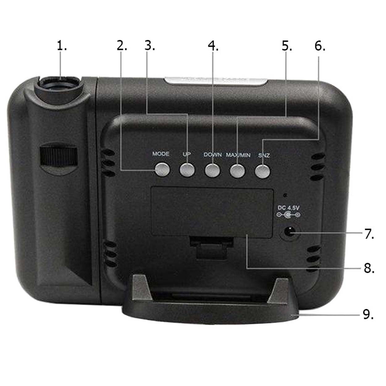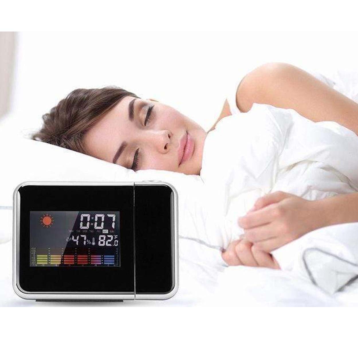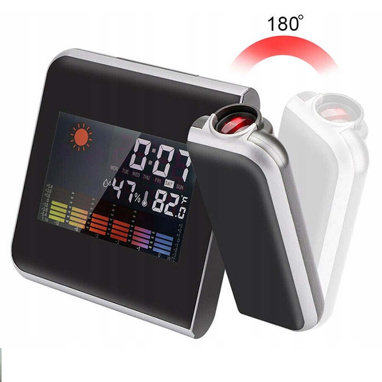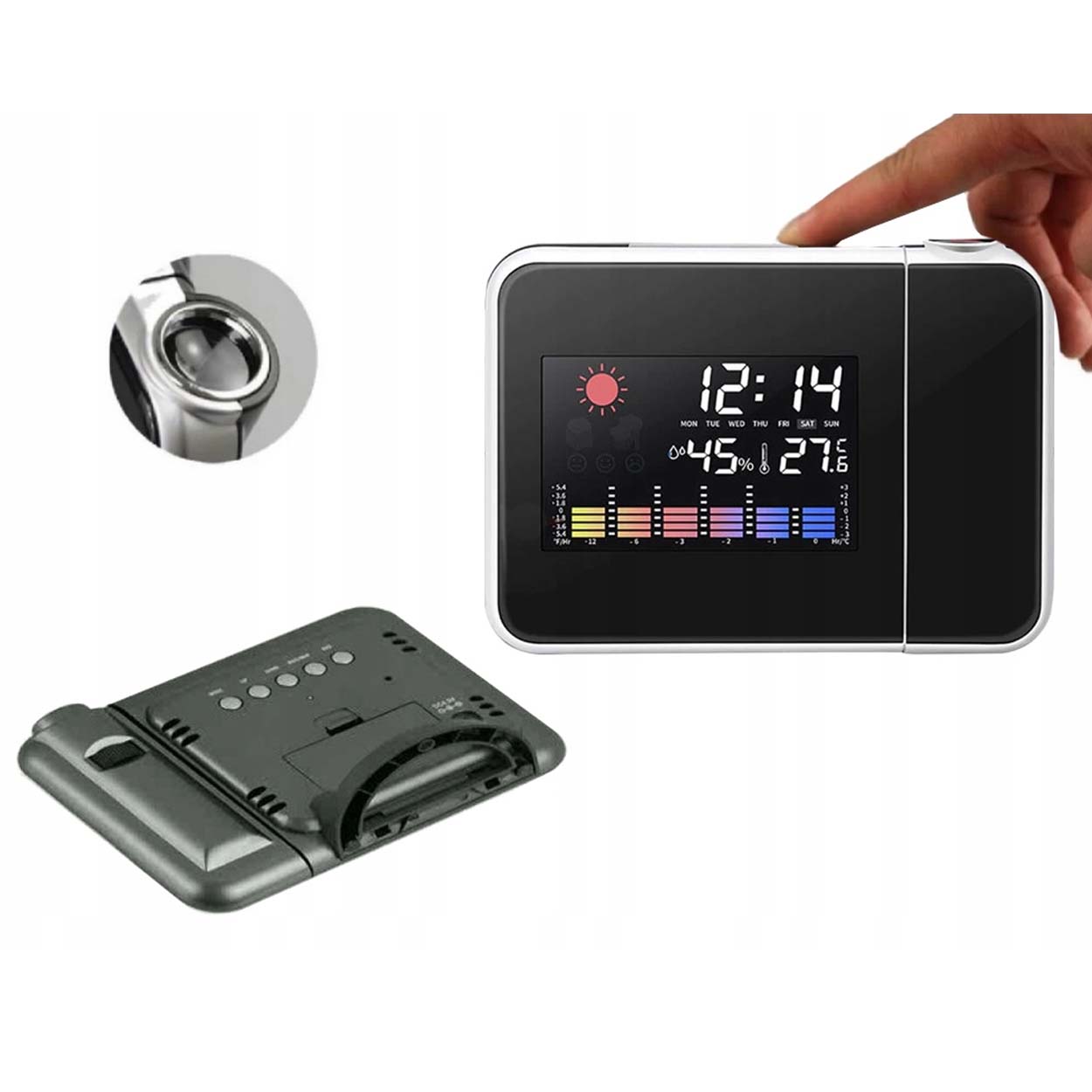 Väderstation med projektorklocka som ger snabb överblick över inomhusklimat och tid. Temperatur och luftfuktighet visas på en tydlig färg-LCD, tillsammans med grafiska väderikoner för soligt, delvis molnigt, molnigt och regnigt. Projektorn kan justeras i fokus och vinkel så att tiden kan projiceras på vägg eller tak, även i mörker. Enheten har 12/24-timmars visning, alarm och snooze samt min/max-registrering för både temperatur och luftfuktighet. Halkfri bas ger stabil placering på bord eller fönsterbräda.