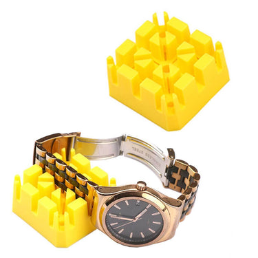 Klockhållare som ger ett stabilt stöd när klockarmband ska bytas eller kortas. Hållaren fixerar armbandet så att stift och länkar kan bearbetas mer kontrollerat, vilket minskar risken att armbandet glider under arbetet. Passar för många typer av klockarmband och används ofta tillsammans med hammare och stiftverktyg vid justering. Levereras som enbart hållare.